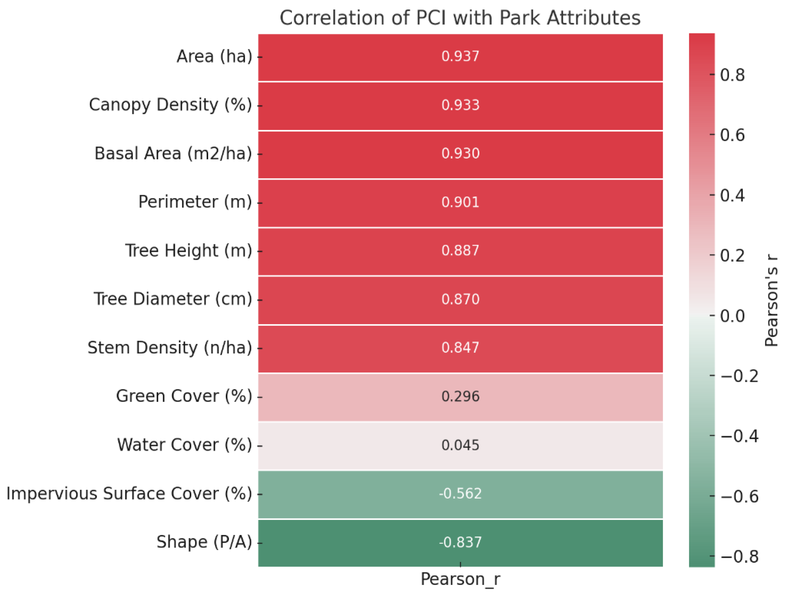 | Park | PCII (°C) | Vegetation Characteristics | Park Characteristics | ||||||