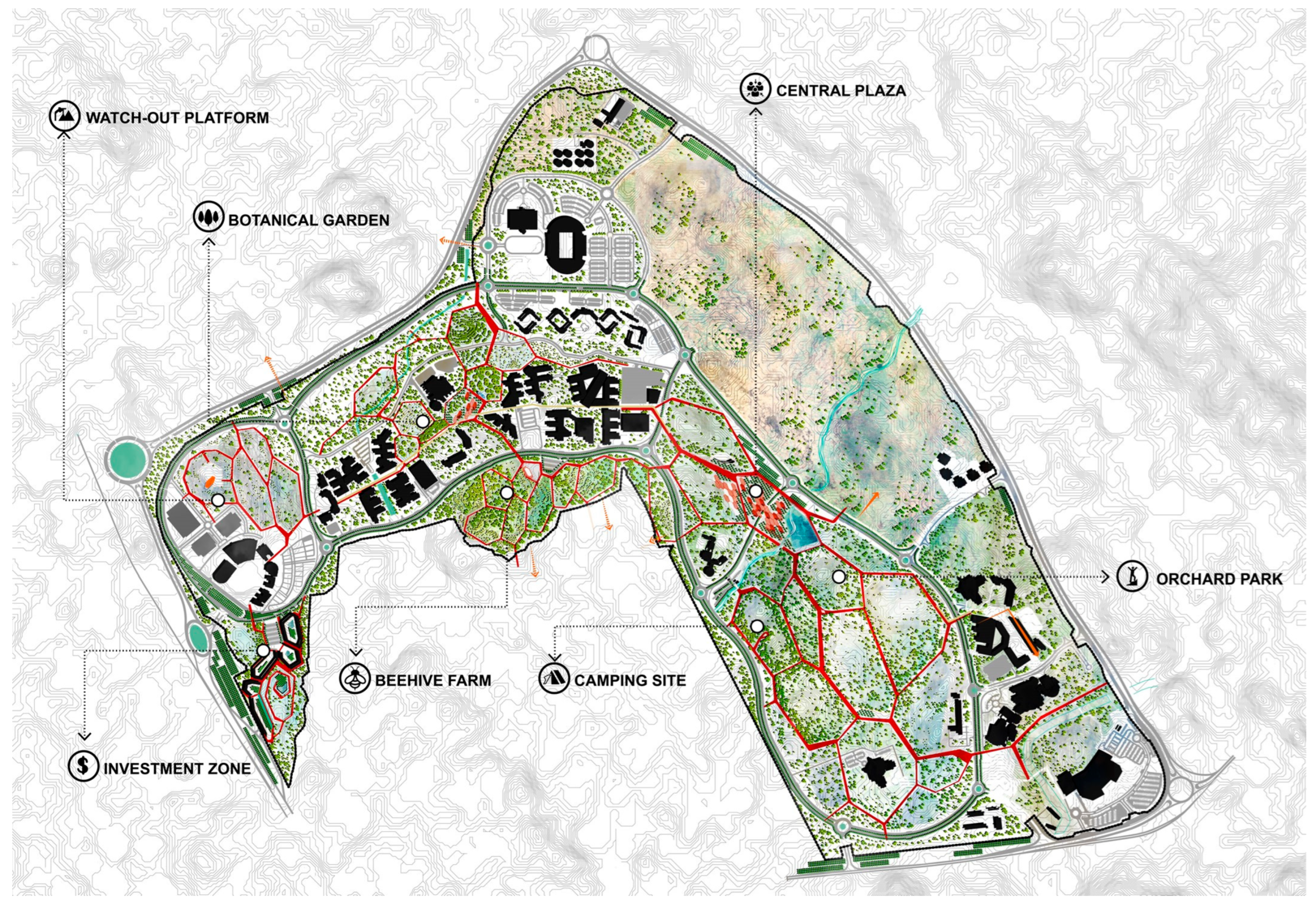 - Zone 03: The orchard park is strategically situated in the rocky landscape zone, identified as a high-value area according to the LCA results map. This setting is distinguished by a rugged formation, scattered native vegetation, and visual drama, making the park a place to relax, exercise, and socialize.