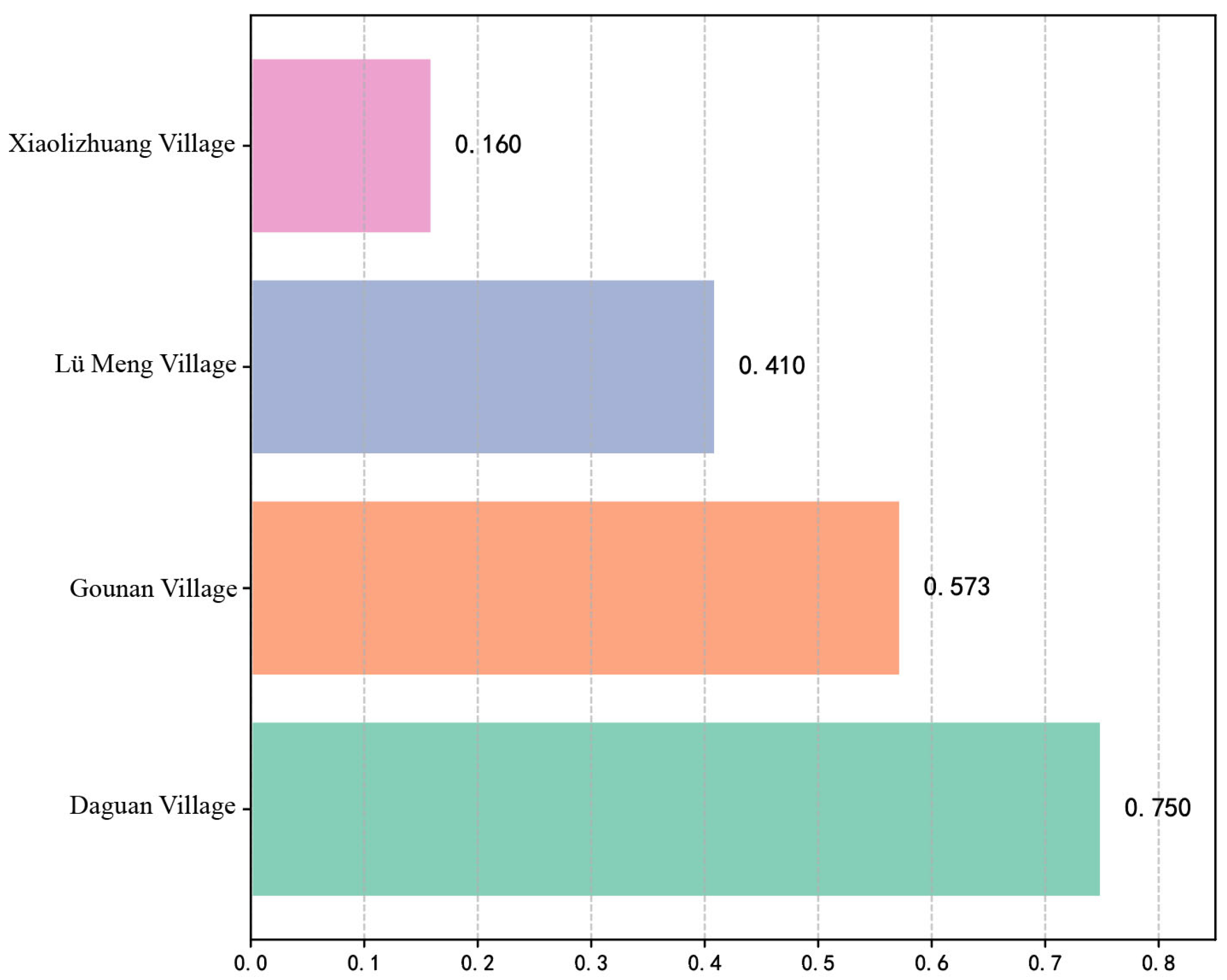 - The comprehensive health index revealed clear spatial differentiation among the four villages. Daguan Village achieved the highest overall level (HI = 0.750), while Xiaolizhuang Village ranked the lowest (HI = 0.160), forming a pronounced gradient pattern of “gateway villages leading—resource-based villages following—traditional villages lagging”. This differentiation reflects uneven development outcomes under tourism influences, consistent with the subsystem index comparison.