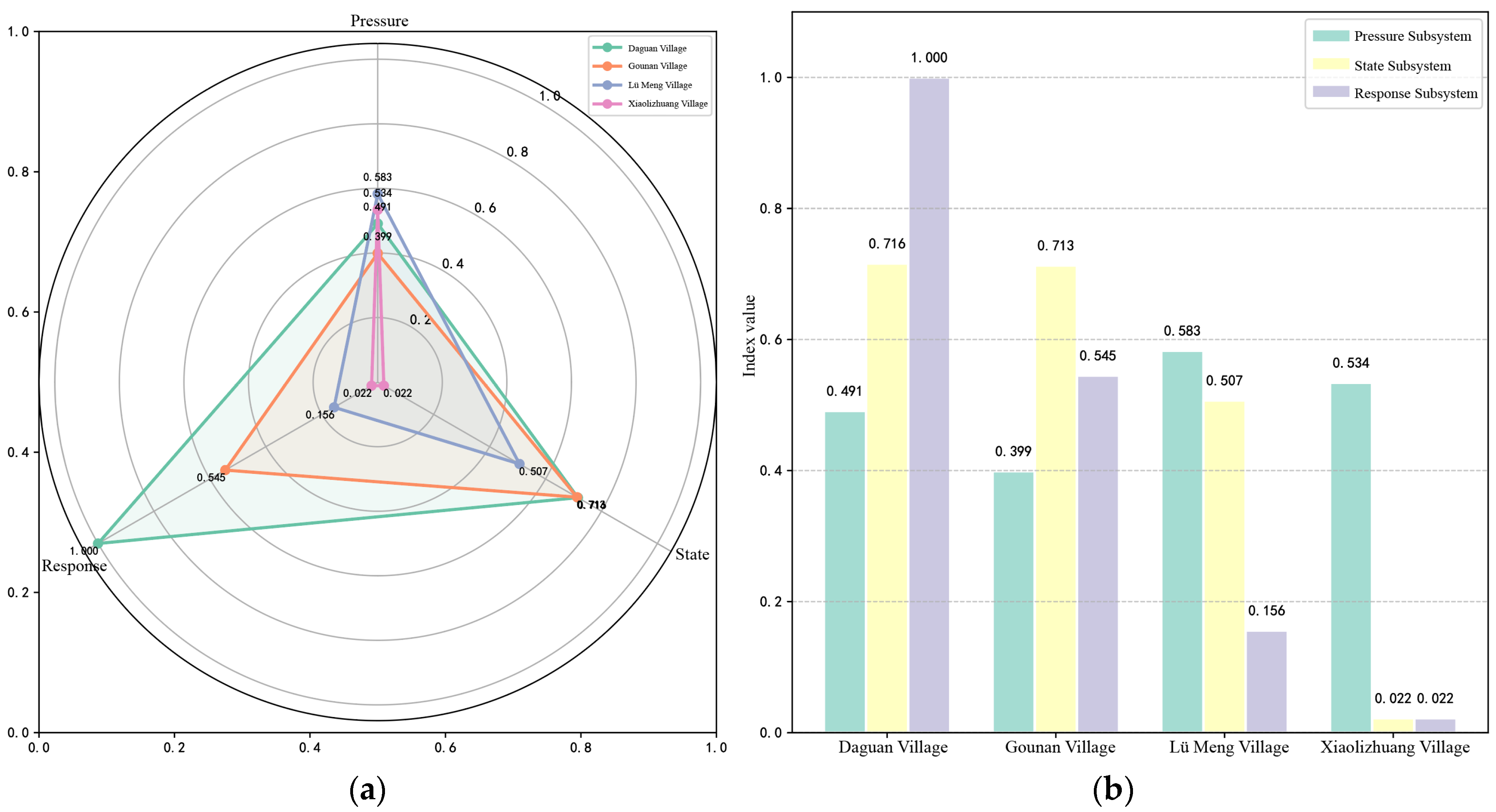 - Subsystem analysis further reveals each village’s strengths and weaknesses. Daguan Village demonstrates advantages in the Response dimension; Gounan Village relies heavily on cultural resources but suffers from insufficient governance; Lümeng Village faces excessive pressure with limited governance capacity; and Xiaolizhuang Village falls into a “dual-low” dilemma in both State and Response dimensions.