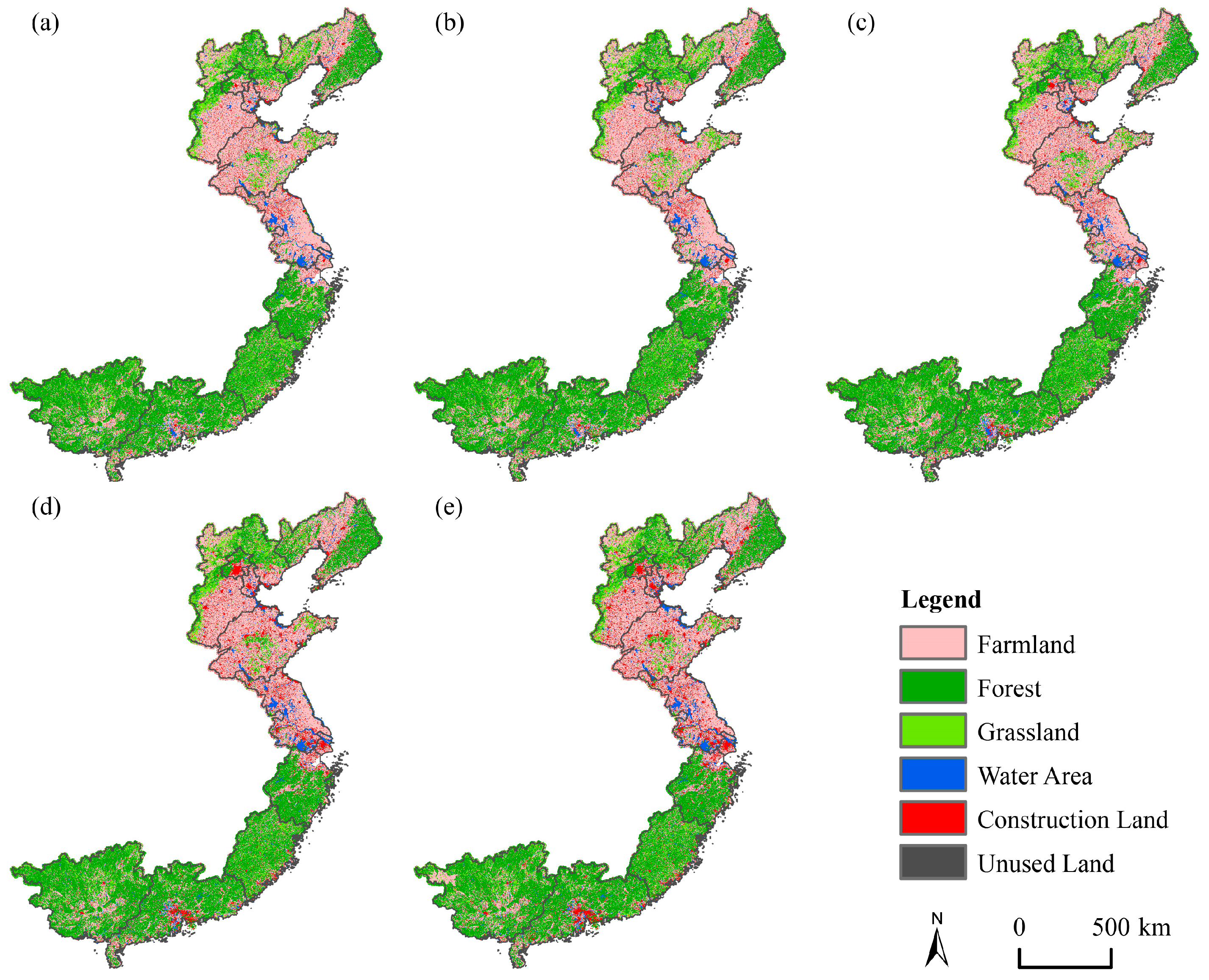 Spatially, farmland was concentrated in the plains of Jiangsu, Shandong, and Hebei; forestland prevailed in the mountainous/hilly terrain in the northeast (Liaoning) and south (Zhejiang, Fujian, Guangdong, and Guangxi); grassland clustered in the ecologically fragile northern and western zones; water areas displayed linear distributions along rivers, lakes, and coastlines; and construction land agglomerated in core urban clusters, particularly the Yangtze River Delta, Greater Bay Area, and Bohai Sea Rim. Notably, construction land expansion was most intensive in prime farmland zones, such as the North China Plain and Yangtze River Delta, forming a distinct spatial pattern of “core urban encroachment–peripheral farmland loss”.