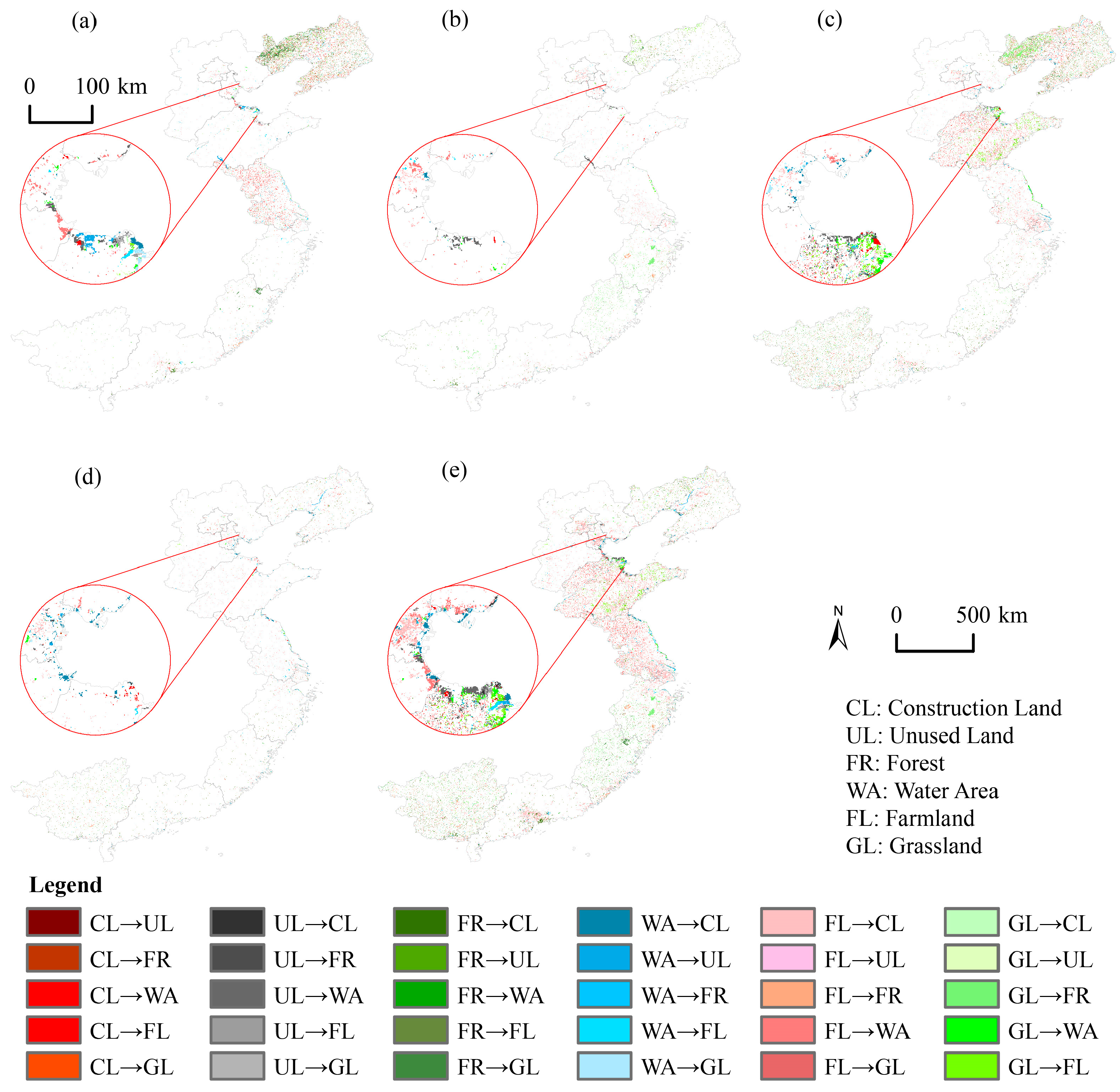 Figure 3. Spatial transition of land-use types in Coastal China: (a) 1980–1990; (b) 1990–2000; (c) 2000–2010; (d) 2010–2020; (e) 1980–2020.
