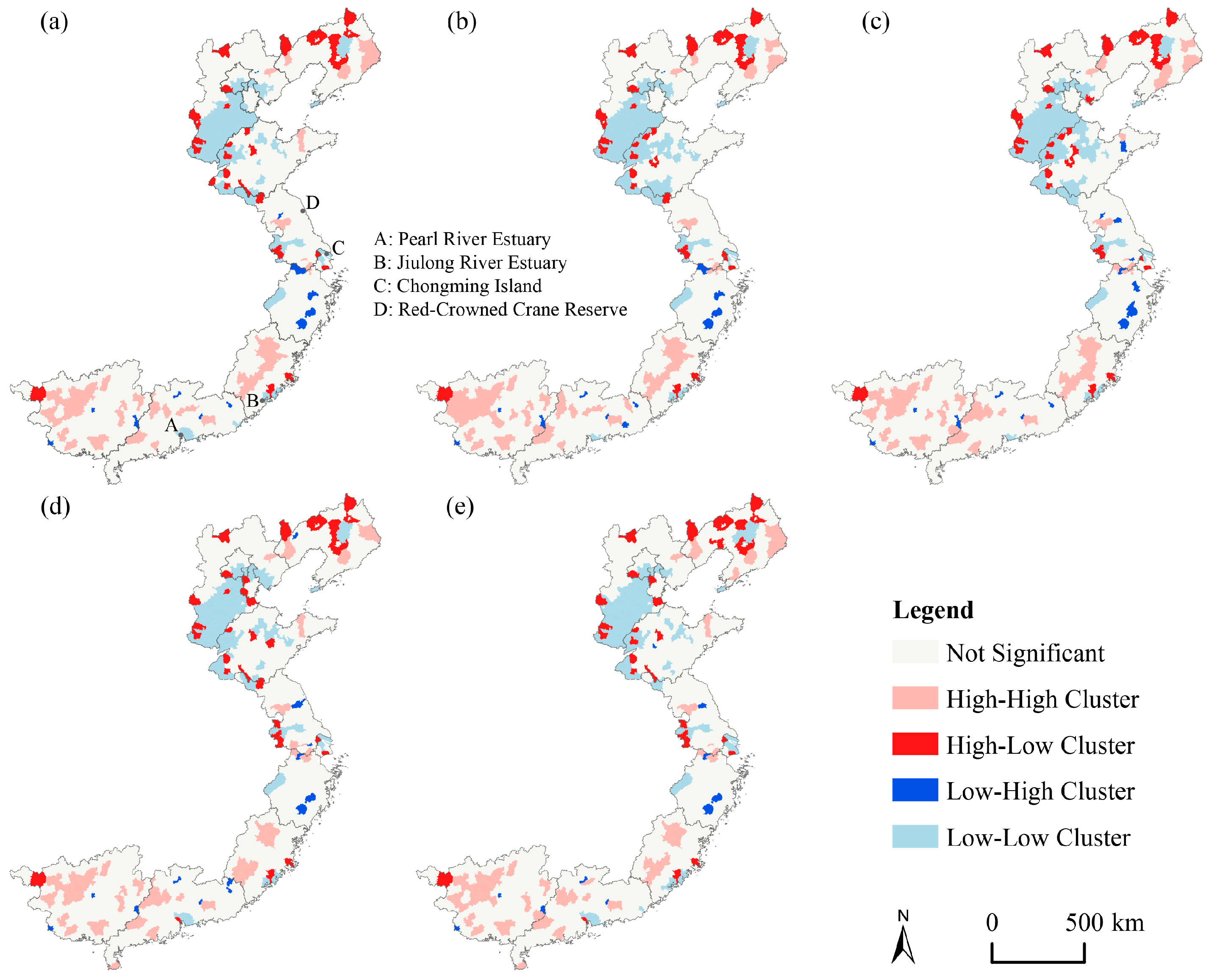 Figure 5. Spatial cluster analysis of ESV in Coastal China: (a) 1980; (b)1990; (c) 2000; (d) 2010; (e) 2020.