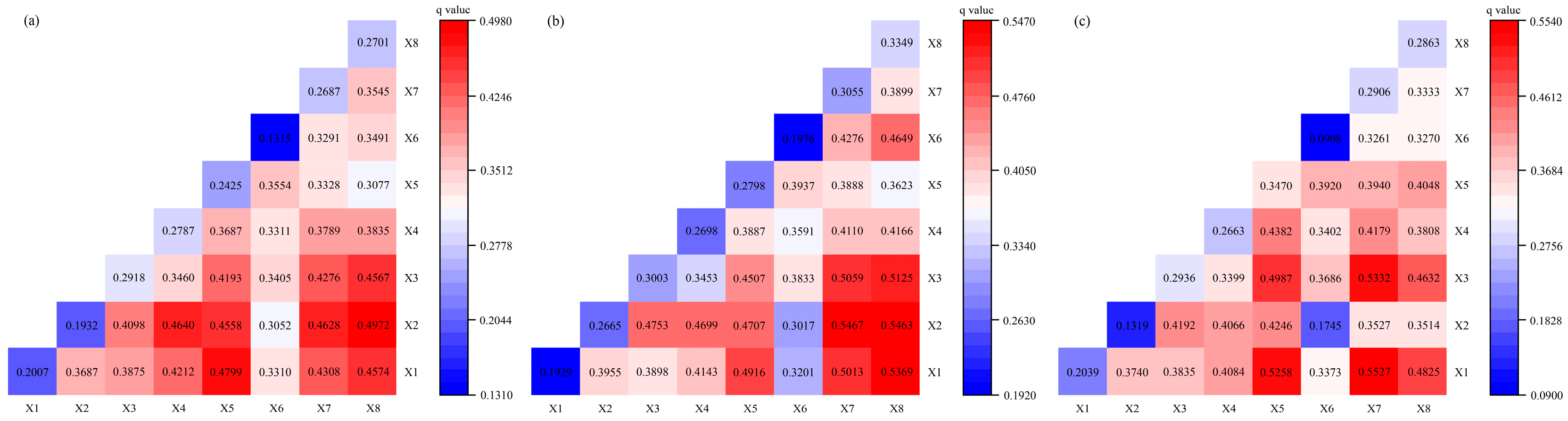 Based on the factor interaction detector results from Geodetector (Figure 6), the interactions between all the influencing factors showed a significant enhancement compared to the effects of the individual factors alone. Among the 48 interaction detector datasets, all factor combinations exhibited a bivariate enhancement relationship. Specifically, the interaction q values in different years were as follows. In 2000, the interaction between annual mean precipitation (X2) and GDP (X8) had the highest q value of 0.50. In 2010, the interaction between annual mean precipitation (X2) and population density (X7) reached a q value of 0.55. In 2020, the interaction between annual mean temperature (X1) and population density (X7) had a q value of 0.55. Further analysis indicated that the explanatory power of certain factor combinations, such as annual mean temperature (X1) with GDP (X8), annual mean temperature (X1) with population density (X7), annual mean temperature (X1) with NDVI (X5), annual mean precipitation (X2) with NDVI (X5), annual mean precipitation (X2) with elevation (X4), annual mean precipitation (X2) with slope (X3), slope (X3) with GDP (X8), slope (X3) with population density (X7), and slope (X3) with NDVI (X5), remained above 0.40 from 2000 to 2020.
