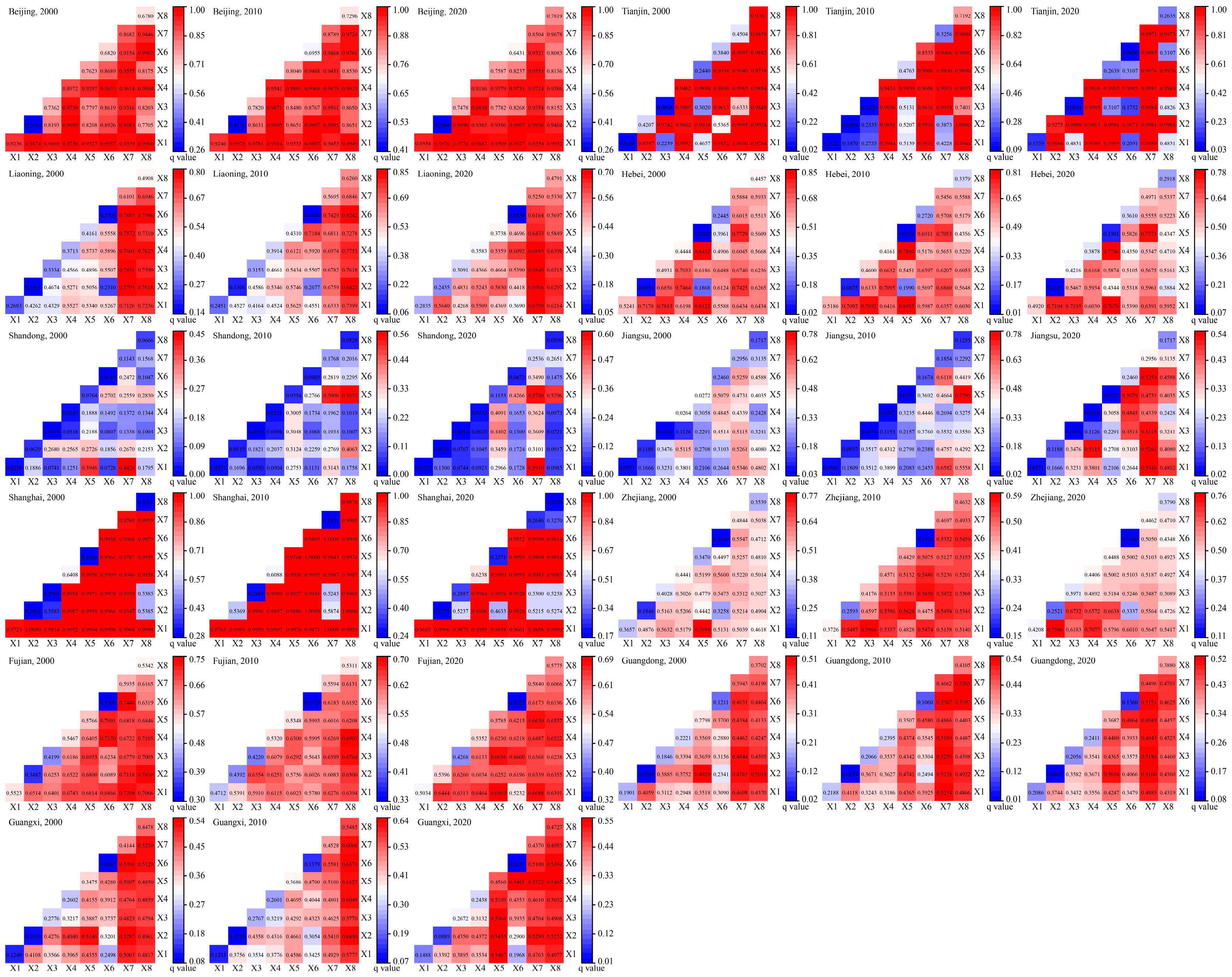 The ESV in Shanghai in 2000 was dominated by socioeconomic factors, such as population density (X7) and GDP (X8), reflecting its status as an economic centre. By 2020, both the natural and socioeconomic factors had significant q values, with more complex interactions. The ESV in Tianjin in 2000 was influenced equally by the natural and socioeconomic factors, including annual mean temperature (X1), annual mean precipitation (X2), population density (X7), and GDP (X8). In 2020, the q values of these factors remained high. Owing to its location on the North China Plain, elevation (X4) and slope (X3) had less impact, whereas the climate and human activities were more influential.