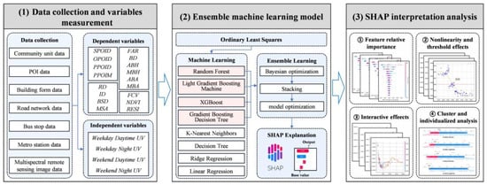In recent years, machine learning algorithms have been widely applied in the research of nonlinear relationships due to their advantages in nonlinear modeling and high-dimensional data processing capabilities, especially suitable for the situation where there are many dimensions of independent variable indicators (Wang et al., 2022; Liu et al., 2023; Wang et al., 2025) [19,20,21]. The emergence of interpretable machine learning tools such as the SHAP algorithm enables the explanation of the feature importance and interaction effects of independent variables [22]. However, it was found that when dealing with the modeling task of multi-dimensional BE and multi-temporal UV, a single machine learning model generally does not guarantee a high coefficient of determination (R2) in all periods. This problem limits the interpretability of the model in different time dimensions. In recent years, the ensemble machine learning algorithm reduces the bias and variance of a single model by integrating the prediction results of multiple machine learning models, providing the possibility for the performance optimization of machine learning algorithms [23,24]. Meanwhile, ensemble machine learning can also improve the overall generalisation of the model, which opens up the possibility of model migration between different times. Bansal et al. (2024) studied the relationship between urban morphology and canopy urban heat island at different times of the day through multiple integrated machine learning algorithms [25]. Tao et al. (2025) used interpretable machine learning to reveal the nonlinearity and threshold points in the spatial and temporal variability of bus travel as a function of travel frequency [26]. Therefore, this study uses ensemble machine learning models to transfer to the modeling task of BE and UV in different times, which can improve the accuracy of the interpretation results of the machine learning model, and more accurately reveal the impact of BE on UV under different time periods of the week.
