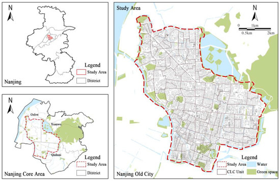 The research area selected for this study is the historic core of Nanjing, delineated by the ancient city walls, as shown in Figure 2. Nanjing is a central political, economic, cultural, and technological hub in eastern China. It holds significant strategic importance in the Yangtze River Economic Belt [35]. The designated study area, referred to as “Nanjing Old City,” is defined by the Ming Dynasty city wall as its primary boundary, covering an approximate area of 43 km2. Compared to the areas beyond the city walls, the study area exhibits diverse and well-established urban spatial patterns, with stable and varied human activity dynamics, and the choice of this study area can effectively reduce the interference of urban location differences on the results of the study. However, the Old City also faces challenges such as functional decline, physical deterioration, and ecological degradation, which have hindered the full activation of UV. Therefore, this study selects 129 CLC units within the Nanjing Old City as the research objects (Figure 2). The CLC unit in this study is the unit of urban administration in China, and also the basic unit for the government to provide infrastructure and supporting living services.
