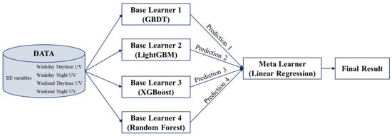 - In the Stacking strategy, Linear Regression was selected as the meta learner to remodel the prediction results of the four base learners. Logistic Regression can effectively learn the optimal weights of each base learner in the final prediction and implement a weighted combination of the results, thereby integrating each model’s advantages and improving the ensemble model’s robustness. The algorithm principle of ensemble machine learning is shown in Figure 3.