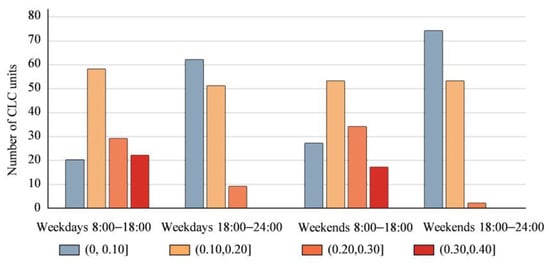 Figure 4 illustrates the distribution and intensity of UV across different time periods. The UV value is higher overall during the day than at night, and slightly higher on weekdays than on weekends. The fact that the UV of a large number of CLC units on weekends was concentrated at a low or relatively low level suggests a lack of incentive for urban residents to go out at weekends. There are a few CLC units with high UV at night on weekends, which indicates that the UV of the Nanjing Old City has declined to a certain extent.