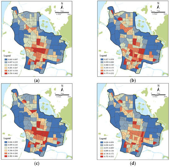 Figure 5 presents the spatio-temporal distribution of UV across different time periods. Overall, the results indicate a pronounced clustering effect and an uneven spatial distribution of UV in the study area. Higher UV value units are predominantly located in the central areas and along major urban corridors. In contrast, units near the eastern and western edges of the city wall generally exhibit lower UV, with more pronounced day-night fluctuations. Figure 5a demonstrates that on weekdays during the daytime, higher UV is concentrated in several business centers along the city’s main corridors. Figure 5b shows that some CLC units in the central business district experience vitality depressions at night, indicating that specific communities fail to sustain high activity levels. Figure 5c,d reveal that on weekends, relatively higher UV units emerge on the outskirts of business districts, suggesting that many residents tend to engage in leisure and recreational activities near their residential areas [41].