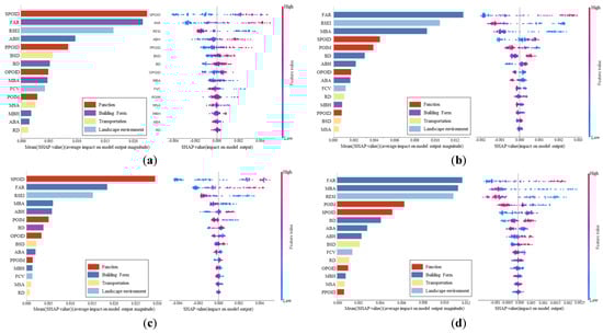 The SHAP algorithm is used to interpret the contribution of independent variables in machine learning models to the prediction results. The sum of the relative importance values of all independent variables equals 1, accurately reflecting the impact of each BE variable on UV across different time periods. The bar chart in Figure 6 arranges BE variables in descending order based on their global correlation, with the mean SHAP value on the horizontal axis representing their relative importance. SPOID, FAR, and RESI consistently maintain high importance across all time periods, indicating that they are the primary determinants of UV’s spatial distribution. Meanwhile, results suggest that the impact of transportation dimension on urban vitality is not significant in different time periods. On the one hand, it shows that the total length of roads per unit area has a weak impact on UV. On the other hand, it shows that due to the small regional differences in the study area, and the overall convenience of public transport [42].