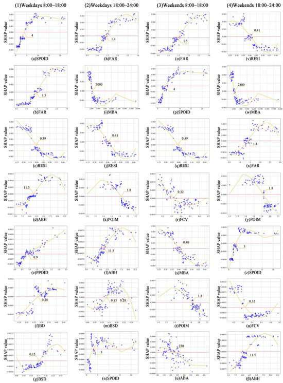 This study employs SHAP-based local dependence plots (LDPs) to reveal the effects of BE factors on UV across different time periods of the week. The fitted curves in the plots smooth the scatter points, where steeper slopes indicate higher marginal effects of the independent variables. This method enables a direct and in-depth understanding of the commonalities and differences in how BE factors influence UV at different time periods, allowing for the quantification of variable threshold points. It is noteworthy that, given the large number of BE variables, this study selects the top 7 most important BE variables in each time period for analysis. Figure 7 illustrates the nonlinear effects and threshold effects of BE variables on UV.