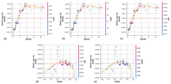 Figure 8a–c demonstrate strong interaction effects between SPOID and FAR, ABH, BD. When SPOID > 5 and FAR > 1.75, ABH > 14, BD > 0.325, a significant positive interaction effect emerges. However, when SPOID > 5, some units with lower ABH still maintain high UV value. A possible explanation is that urban service functions, which attract urban vitality, and are often suitable for lower floors of buildings [45]. When BD remains high, further increasing SPOID does not necessarily improve UV and may even lead to a decline. This could be due to the over-homogenization of urban functions, where excessive uniformity in service offerings reduces attractiveness. Figure 8d,e illustrate that when POIM is between 1.5 and 1.75, BD > 3, and MBA < 3000, strong local interaction effects are observed. A balanced POIM is essential for UV, as an excessively high POIM may result in inefficient land use and diminished UV. Urban planners should strategically allocate urban functions based on building morphology, optimizing the balance between service types to attract foot traffic and stimulate economic activity.