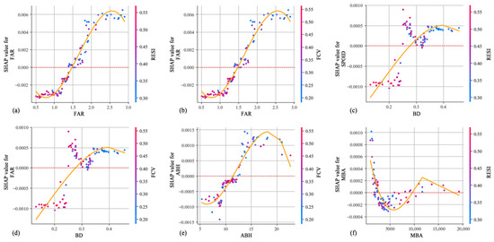 Figure 9a,b reveal that when FAR is between 1.5 and 2.5, RESI is between 0.30 and 0.40, and FCV is between 0.2 and 0.3, their positive interaction effect is most pronounced. Beyond this range, further increasing FAR does not improve UV, likely because excessively high FAR contributes to traffic congestion and infrastructure strain, thereby diminishing residents’ spatial experiences. This result underscores the need to prevent overdevelopment and maintain a livable community environment. Figure 9c,d show that when BD is 0.25, RESI is between 0.40 and 0.50, and FCV is between 0.35 and 0.45, the positive interaction effect reaches its peak. When BD is between 0.25 and 0.30, and RESI and FCV are high, they exhibit synergistic effects on UV. One explanation is that some CLC units with eco-orientated development are able to create high vitality while maintaining low development intensity [46]. Figure 9e illustrates that the interaction effect on UV is strongest when ABH is between 12 and 17 and FCV is between 0.3 and 0.35. Excessively high or low ABH negatively impacts UV. Figure 9f demonstrates that when MBA < 3000 and RESI is between 0.30 and 0.45, the positive interaction effect is strongest. Furthermore, an interaction effect on UV is still observed when MBA is between 10,000 and 17,000, and RESI is between 0.40 and 0.50. These findings suggest that urban planners should implement differentiated planning strategies to meet the varied demands of residents for building space and an ecological environment.