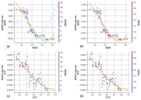 Interaction effects between ecology and function dimensions. (a) Interaction effects between RESI and SPOID; (b) Interaction effects between RESI and POIM; (c) Interaction effects between FCV and SPOID; (d) Interaction effects between FCV and POIM.