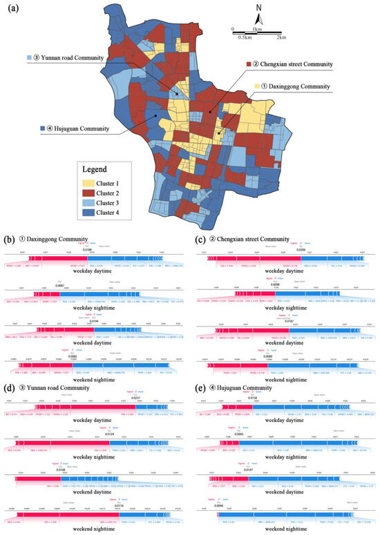 SHAP individual explanations of UV at different time periods. (a) BE clustering results of CLC units; (b) SHAP individual explanations of the Daxinggong Community; (c) SHAP individual explanations of the Chengxian Street Community; (d) SHAP individual explanations of the Yunnan Road Community; (e) SHAP individual explanations of the Hujuguan Community.