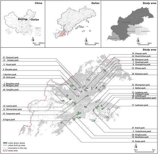 Using Landsat TM/ETM/OLI remote sensing imagery as the primary data source, and incorporating the Dalian Land Use Master Plan (2006–2020) publicly available from the Liaoning Provincial Government, we initially identified 48 parks and plazas. Scenic areas and building-adjacent squares were excluded. Map base layers were obtained from the National Administration of Surveying, Mapping and Geographic Information (standard basemap of China) and the Amap Open Platform (Liaoning Province map). Based on criteria including ease of access, free admission, and clear boundaries, 16 green spaces were removed after field verification (Appendix A.1), resulting in 32 final parks (Figure 1).