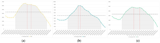 Distribution of Total Activity Volume Over 24 h on Weekdays (a), Weekends (b), and Holidays (c). The red vertical lines represent the periods with the least fluctuation in population activity.