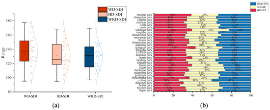 Distribution of gender ratios across case study parks for the three day types. (a) The range of Social Vitality Index (SDI) under different day types, showing the numerical distribution and differences of SDI under the three day types. (b) The percentage of social vitality for each park under the three day types.
