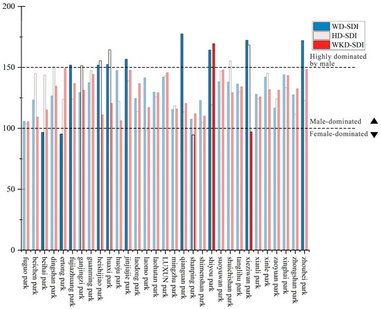 As shown in Figure 5, in terms of spatial density, visitors across different types of days showed a preference for comprehensive parks. Gender differences were minimal in parks characterized by either high visitor numbers and high density or low visitor numbers and high density. However, significant gender differences emerged in parks with high visitor numbers but low spatial density. On weekdays, women showed stronger attraction to cultural parks (e.g., Zaoyuan Park), while men were more frequently observed in comprehensive parks (e.g., Suoyuwan Park). During holidays, women preferred comprehensive and sports parks (e.g., Laodong Park, Shanping Park, and Qianguan Park), whereas men showed higher use of cultural parks (e.g., Dingshan Park). Additionally, parks with both low visitor numbers and low spatial density accounted for a considerable proportion (approximately 50–60%) of all parks. These green spaces represent key targets for future design and optimization.