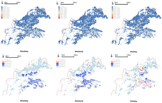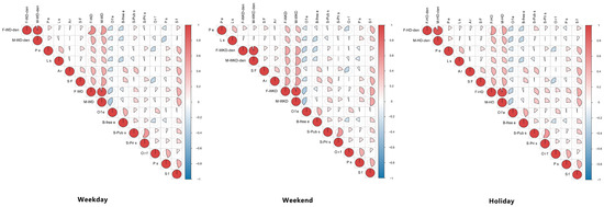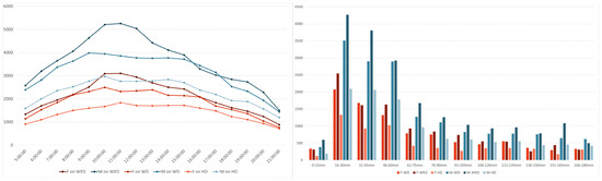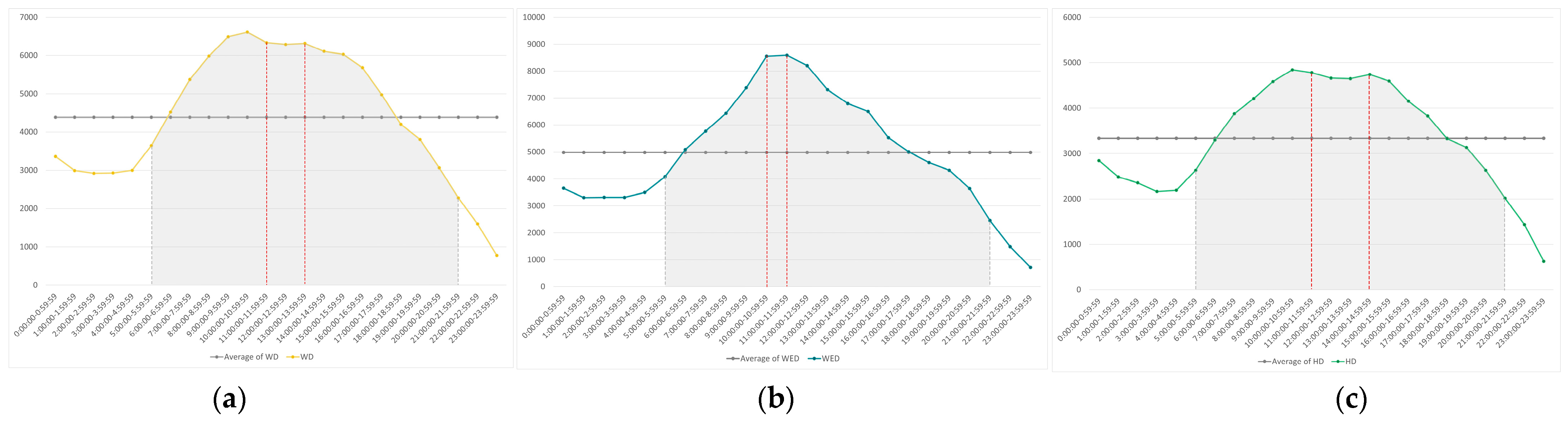 The study period was determined by analyzing the 24 h activity patterns across the three day types (Figure 2). Based on diurnal rhythms of public life, the timeframe from 5:00 a.m. to 9:00 p.m. was selected for detailed analysis. To address potential data biases, spot checks were conducted within this window, confirming that actual activity periods aligned closely with the patterns shown in Figure 2, thereby supporting the data’s rationality and objectivity.
