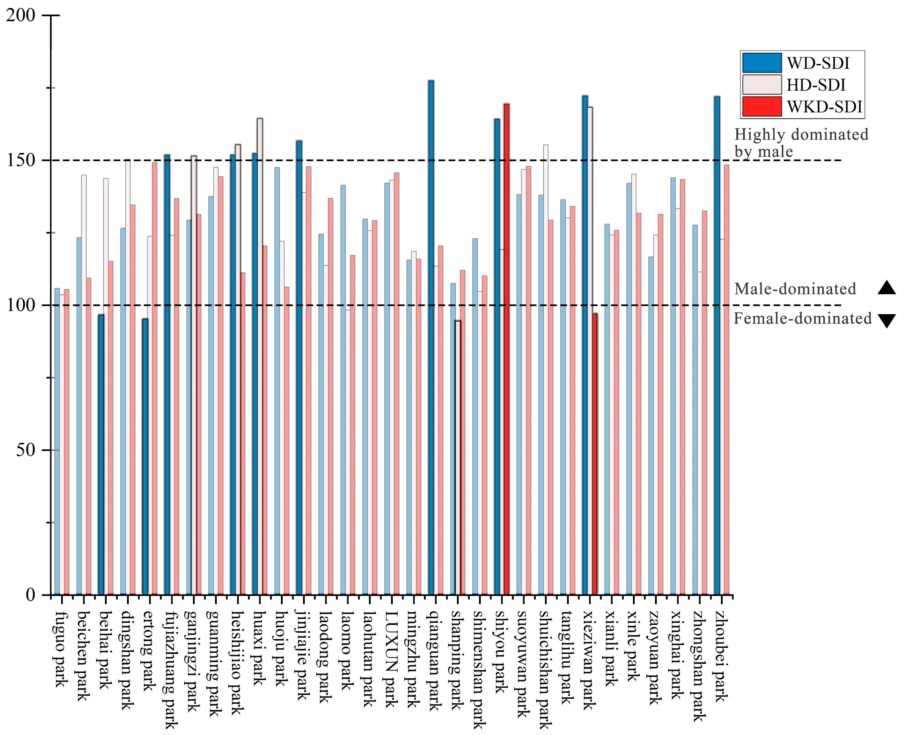 Previous studies have shown that under mild weather and balanced daylight duration, behavioral patterns in spring in northern coastal cities can approximate the overall annual trends in gendered park use [29]. While we acknowledge that seasonal differences may influence the intensity of park visitation, our focus lies in relative gender disparities, which tend to remain stable across seasons [30]. Future research could extend this analysis to multi-season datasets to further validate these findings.
