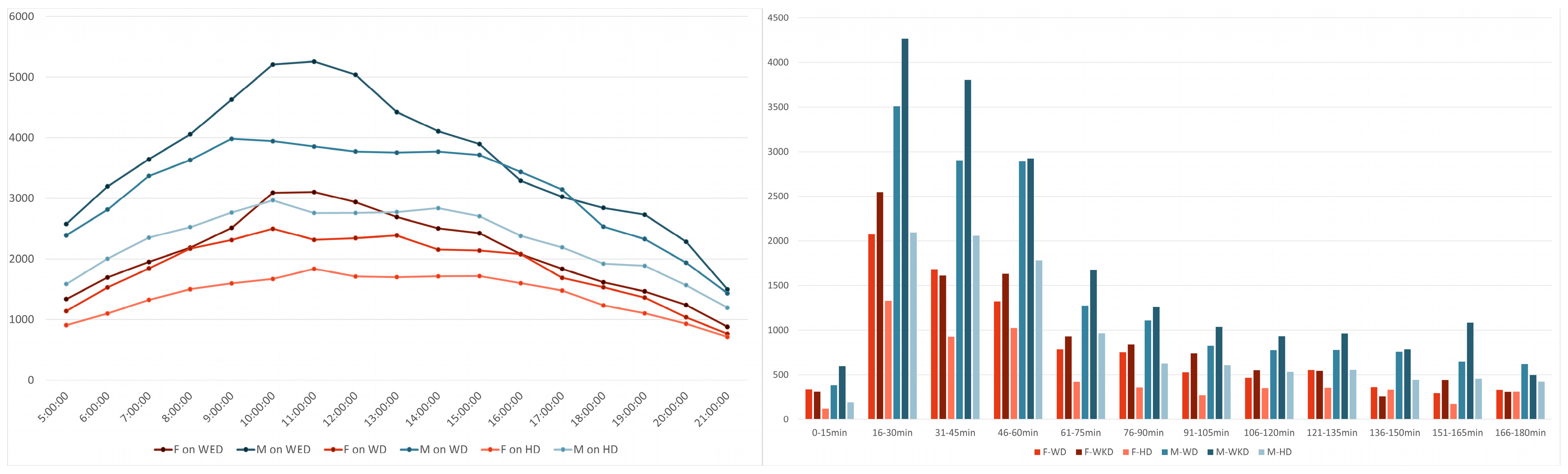 Across different types of days, both males and females exhibited a tendency to visit parks in the morning (Figure 6). On weekdays, males tended to arrive earlier than females (at 7:00 and 9:00 a.m.). Male visitors were present in large and steady numbers between 9:00 a.m. and 3:00 p.m., with another peak around the evening (5:00 and 7:00 p.m.). In contrast, female visitors primarily arrived between 10:00 a.m. and 4:00 p.m. On weekends, both genders showed similar patterns with most visits occurring between 10:00 and 12:00 a.m. On public holidays, males were more likely to visit around 10:00 a.m., while females peaked around 11:00 a.m. Overall, distinct gender-based temporal patterns were observed: males visited both earlier (7:00 a.m.) and later (7:00p.m.), whereas female visitation declined noticeably after 3:00 p.m., with very few visits in the evening.