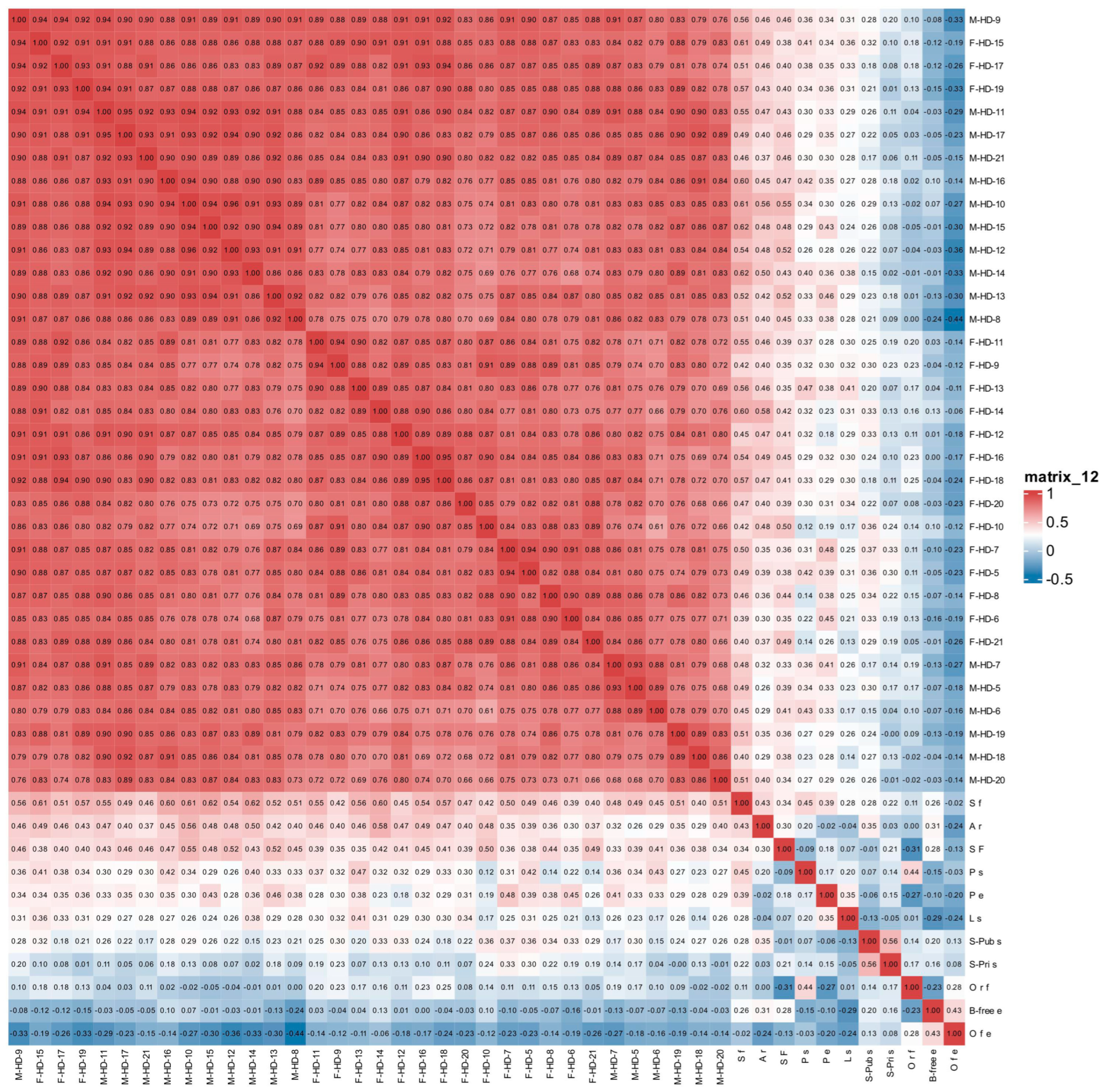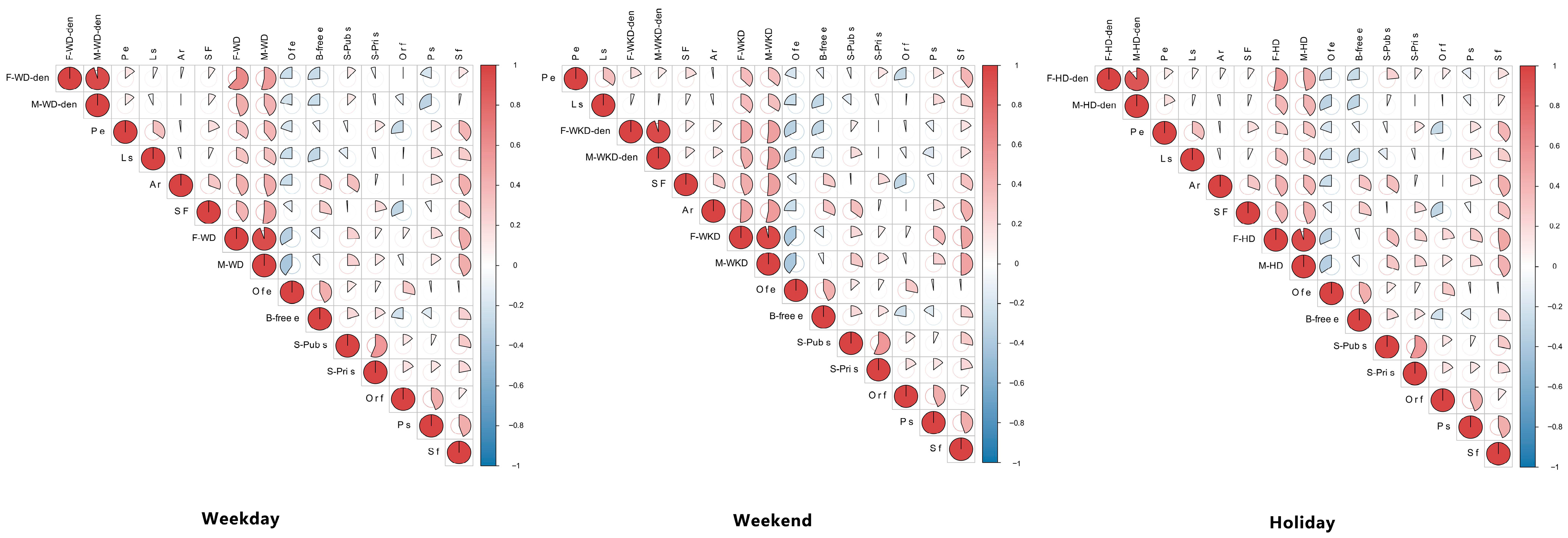 Note: This study examines how the daily patterns of men and women are linked to various influencing factors. The analysis simplifies complex data by focusing on the correlation (from minimum to maximum values) and trends between gender-specific behaviors and particular spatial elements across different times of the day. For detailed data, please refer to the Appendix A.2.