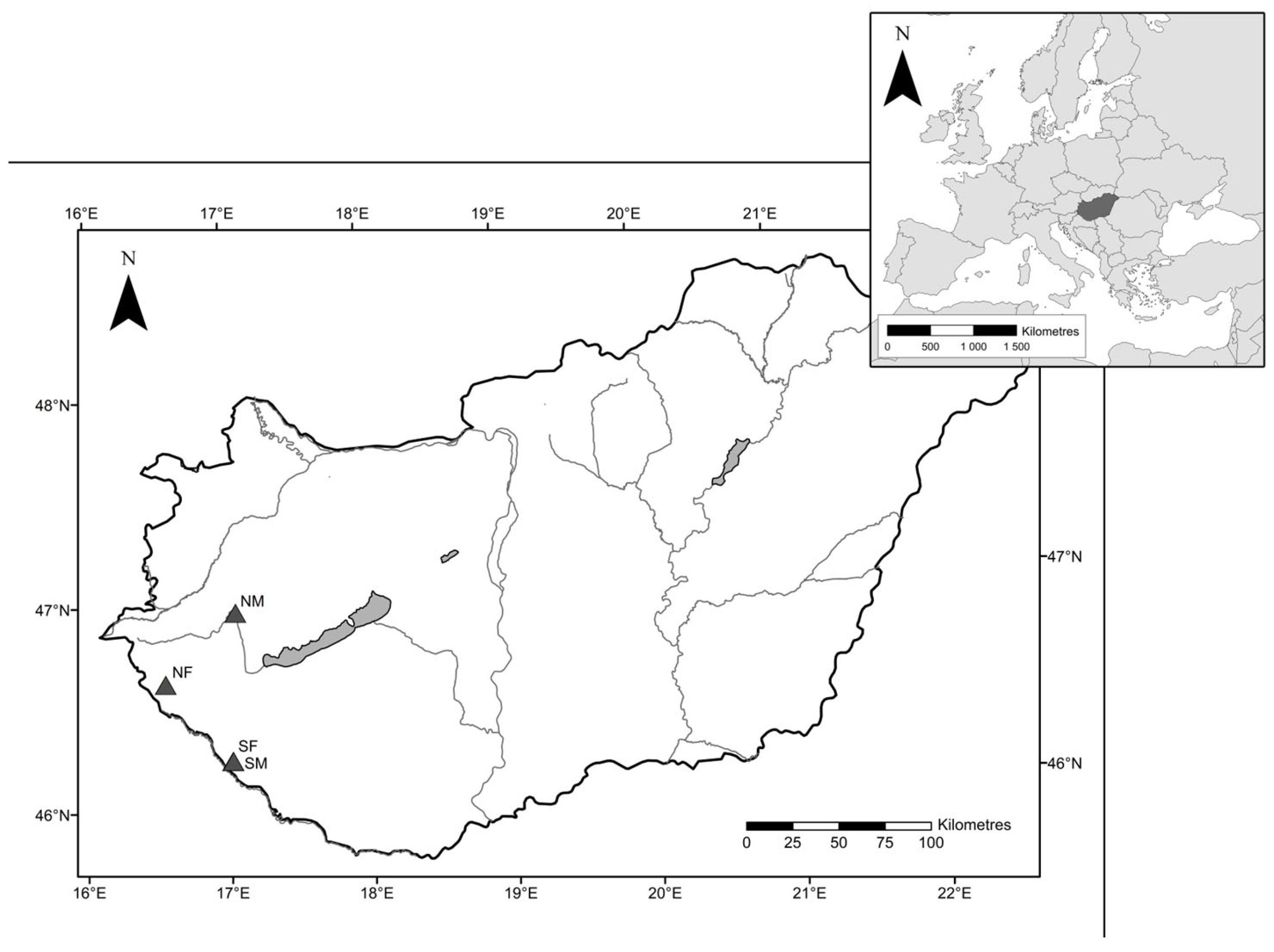 The North Forest population (Lenti) is near the river Kerka, the Western Meadow site (Tüskeszentpéter) is next to the river Zala, the South Forest and South Meadow sites (Gyékényes) are very close to each other near the river Dráva (