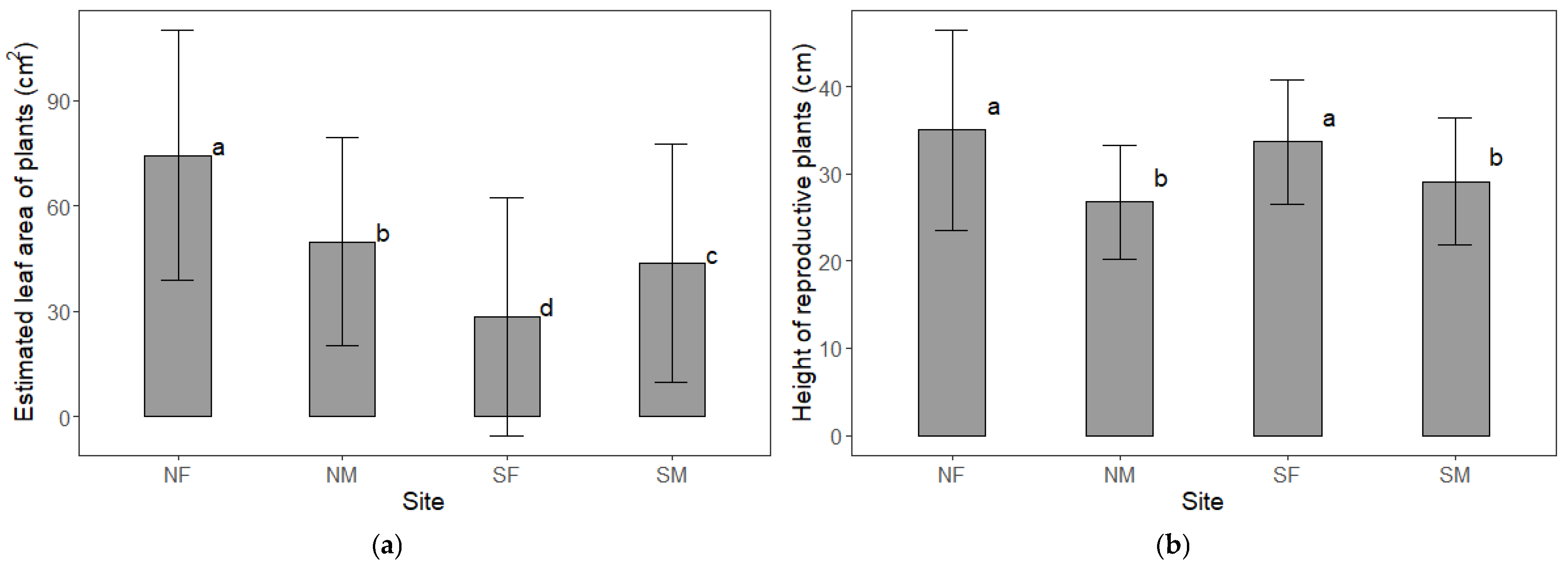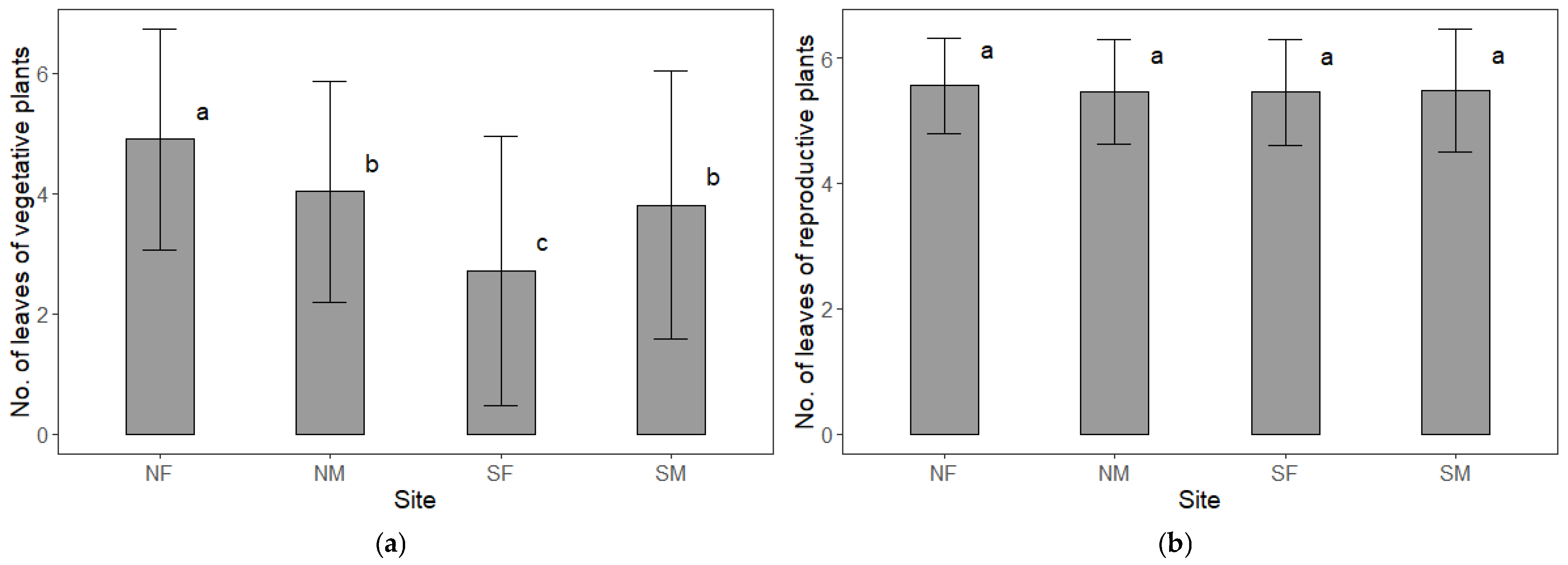 We have only made assumptions about how leaf number could be affected by the habitat. In the meadow, a smaller assimilating surface may be sufficient as the plants grow in less shade; however, the herbaceous layer is generally denser. At the same time, in early spring, when F. meleagris shoots are developing and flowering, there is hardly any foliage in the forest. The average number of leaves of vegetative adult plants was lowest in the forest population in the case of northern populations, but there were no differences between the southern populations.