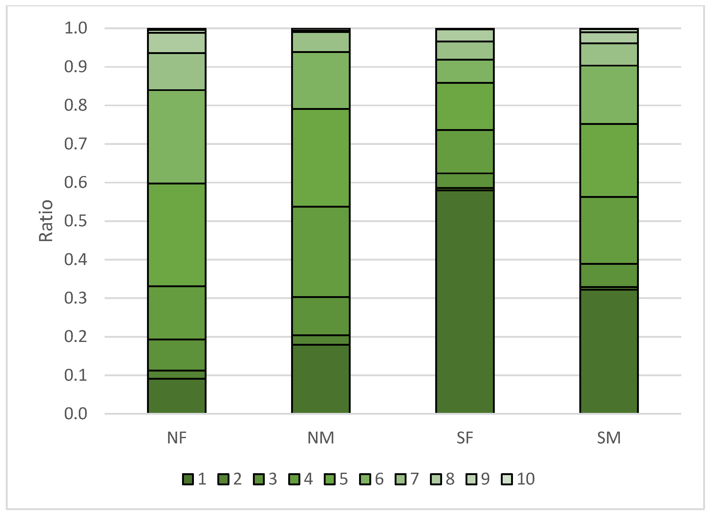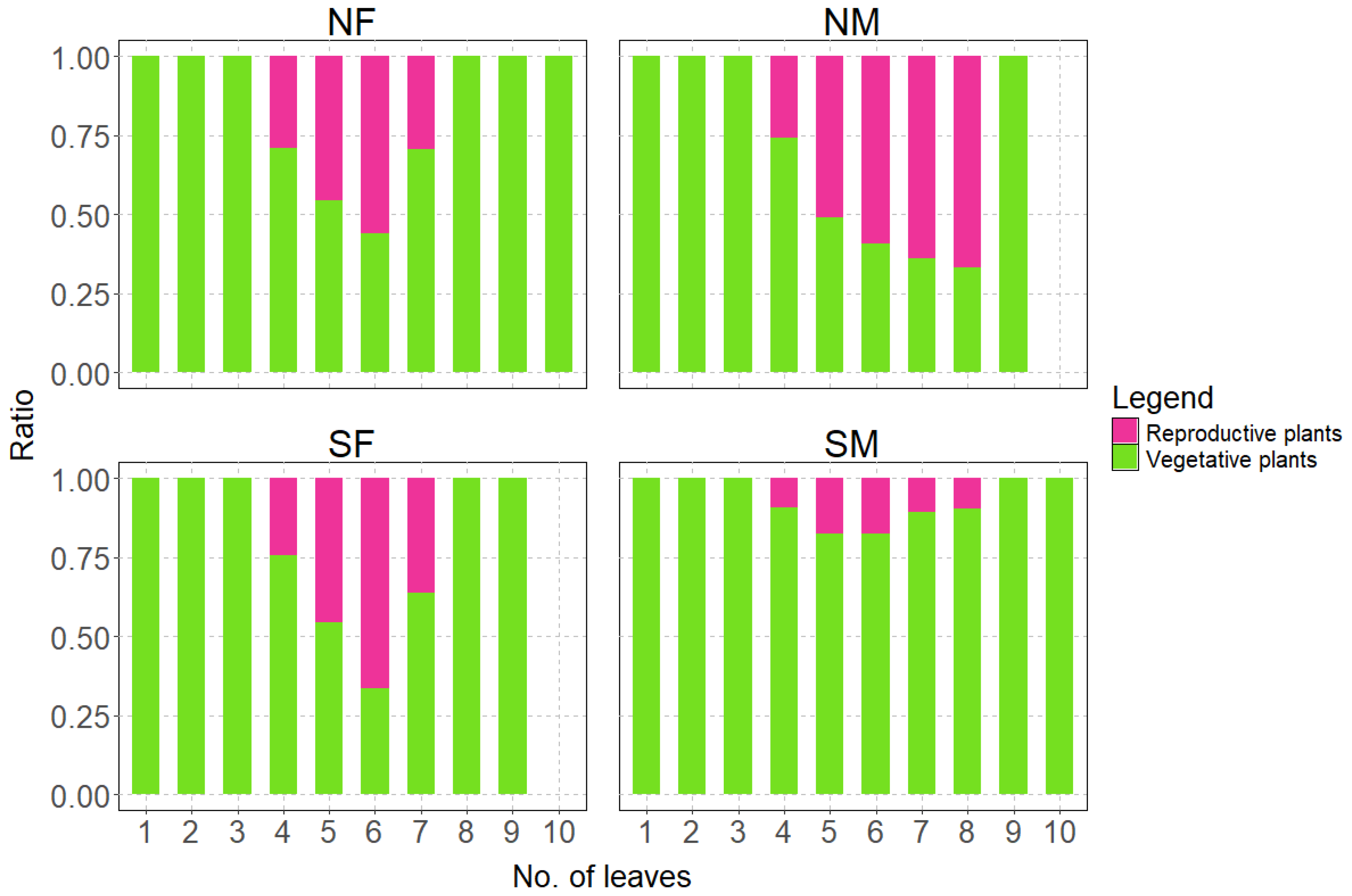 We previously expected that the proportion of flowering individuals would be higher in the meadows than in the forests. Numerous publications have reported that the number of flowering plants considerably exceeded that of vegetative individuals on the meadows [