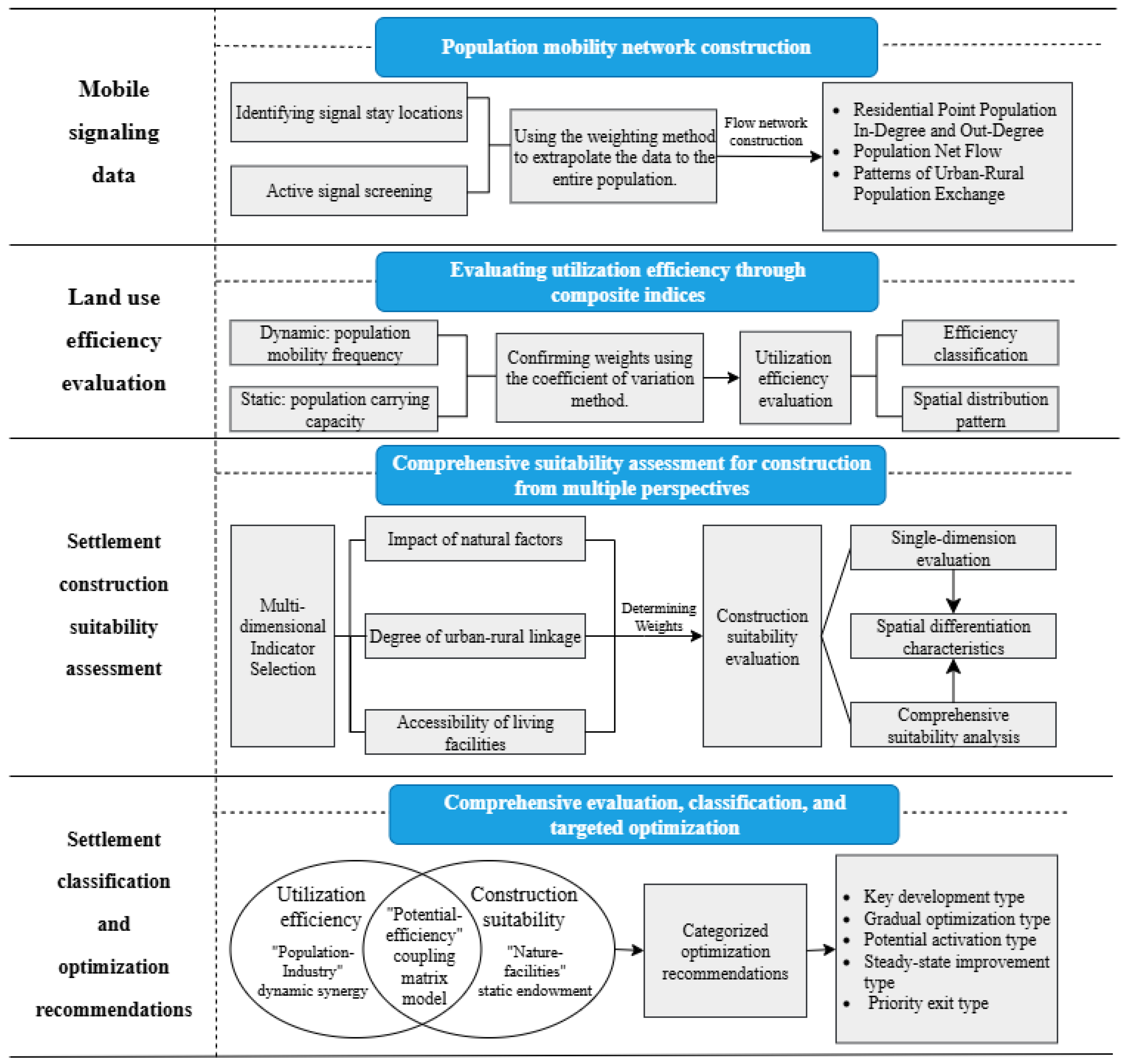 Second, from a dynamic perspective and integrating population mobility features, two indicator systems were developed using multi-source data: one for evaluating settlement utilization efficiency and another for assessing development suitability.