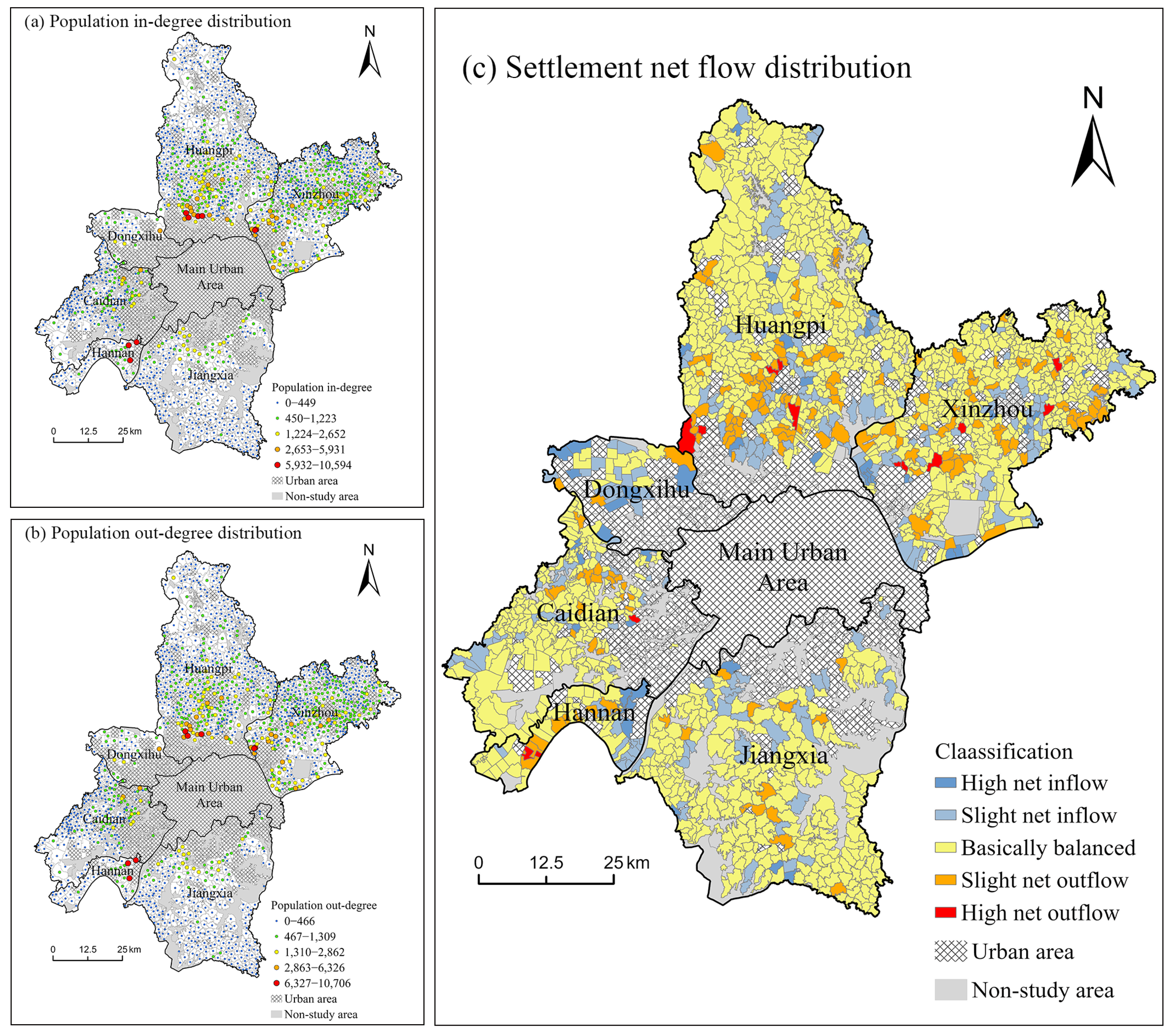 Figure 3). When the net flow difference in a village is within 10 person-times, it is considered to have essentially balanced inflow and outflow, indicating a relatively stable state. When the difference between population in-degree and out-degree falls within the range of 10–50, it is considered a slight net inflow/net outflow. When the degree difference exceeds 50, it is regarded as a high net inflow/net outflow. From an overall spatial distribution perspective, the patterns of out-degree and in-degree are highly similar, exhibiting a spatial structure centered on the main urban area and radiating toward surrounding towns. Active areas are primarily concentrated in urban zones and their peripheries, while mobility frequency significantly decreases in rural regions. There is extensive population exchange between the main urban area, other urban regions, and surrounding villages. Some individuals may commute back and forth, significantly increasing the in-degree and out-degree of these villages. Areas with high frequencies of population inflow and outflow are distributed in small pockets of the eastern part of Hannan District, the southern part of Huangpi District, and the southwestern part of Xinzhou District—all located in the near suburbs of the main urban area. In contrast, villages on the urban periphery generally exhibit lower frequencies of population mobility.