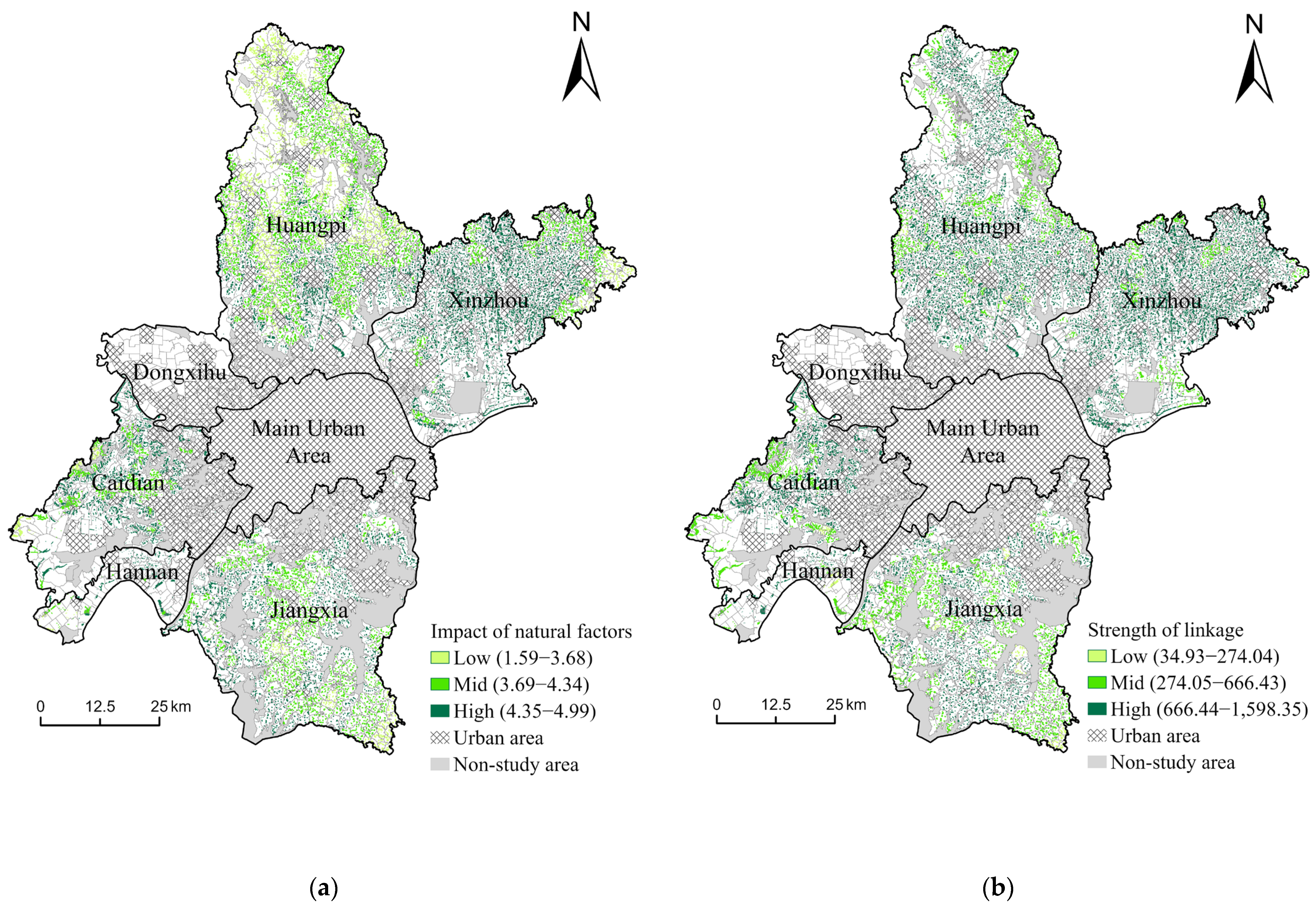 In the urban–rural linkage hierarchy, high-level areas account for 73.08%, medium-level areas for 25.70%, and low-level areas for 1.22%. The urban–rural linkages in Wuhan’s rural areas overall exhibit a pattern of “high proportion, strong radiation,” reflecting the deep integration of urban and rural areas during the urbanization process. High-level areas typically feature relatively complete facilities for daily life, exhibit high economic dependence on cities, and maintain close urban–rural population interactions, with a certain degree of “urban–rural amphibious” phenomenon observed. Medium- and low-level areas are concentrated around water bodies and the edges of distant urban districts, where urban–rural economic linkages are weaker and geographic isolation has a more severe impact. Local industrial development is constrained by a lack of synergy, potentially leading to a series of issues such as reduced employment opportunities, population outflow, and increased vacancy rates in settlements. This results in a waste of resources characterized by “good land without viable industries”.