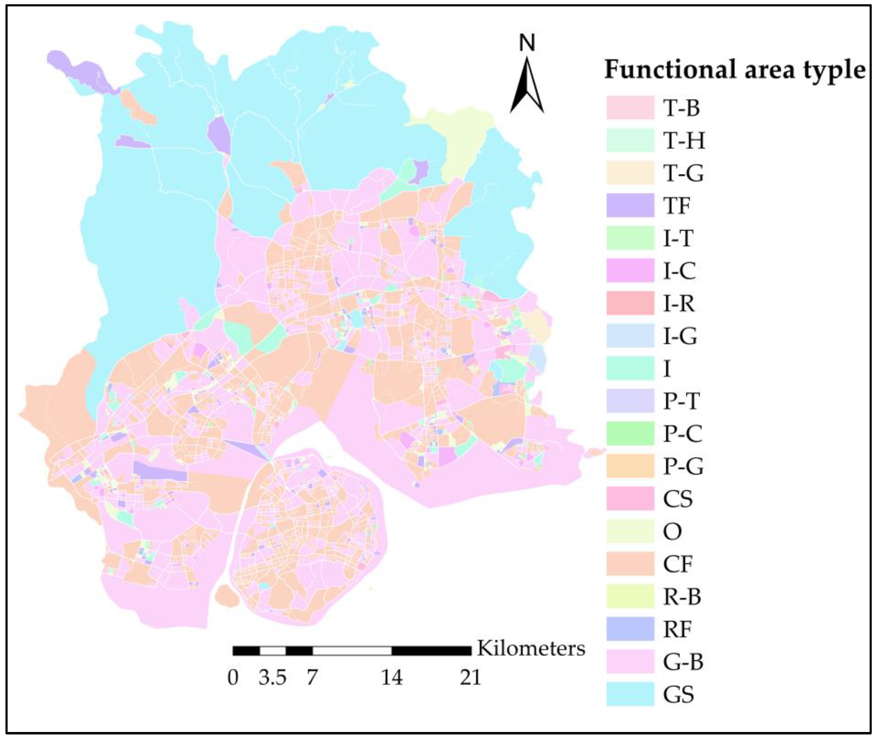 - Song, L.; Wu, Z.; Dai, Z. Identification and analysis of urban functional areas based on multi-source data. Surv. Mapp. Eng. 2023, 32, 63. [Google Scholar] [CrossRef]