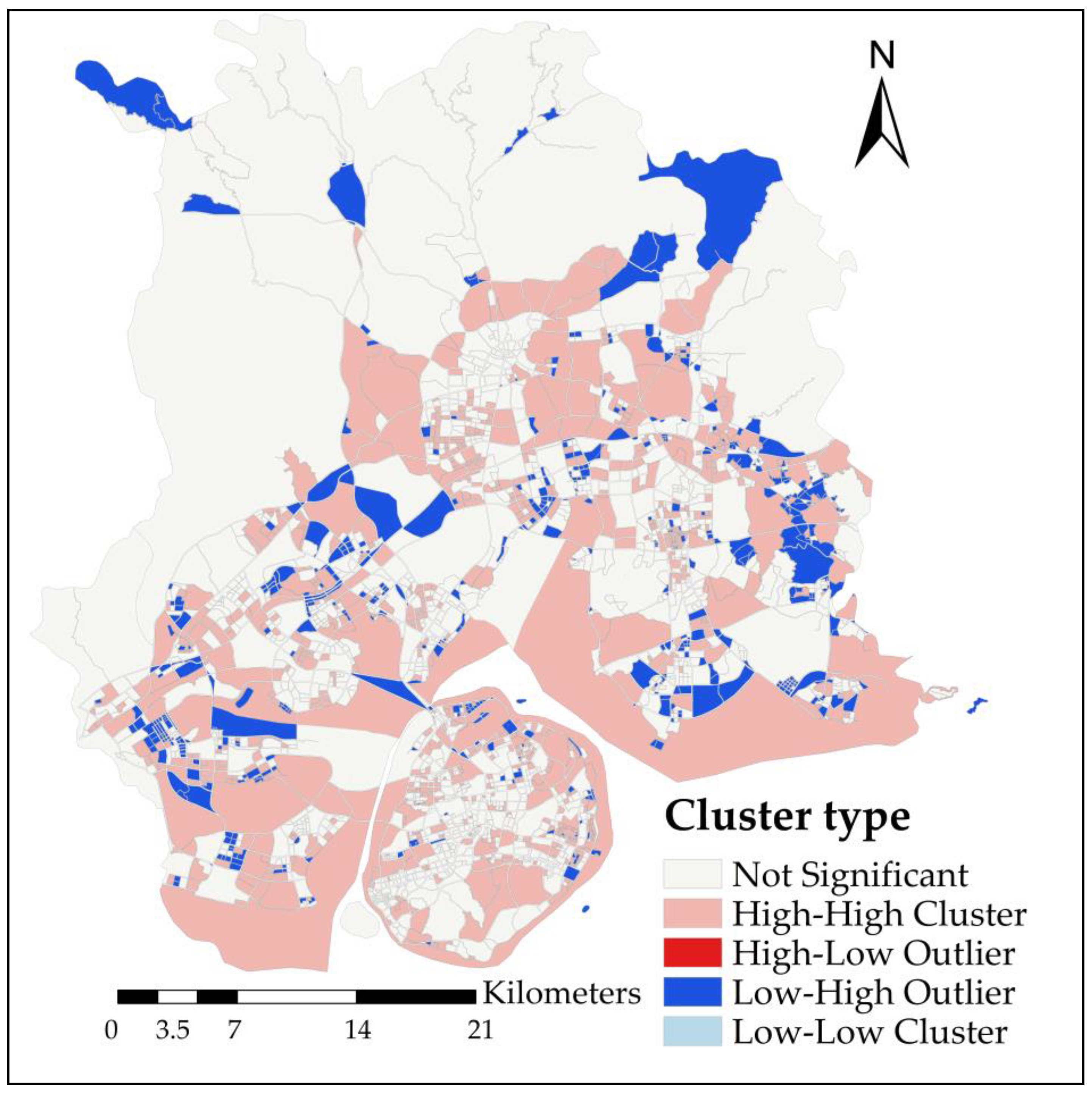 4.2. Spatial Correlation Pattern of Carbon Emissions in Xiamen City