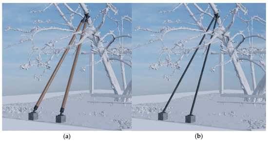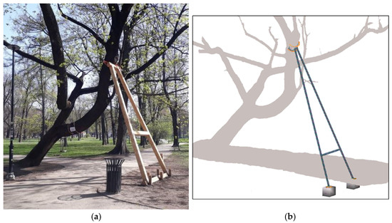 In tree no. 2, according to the method, after LIDAR scanning of the tree (Figure 5b), three-dimensional models of the trees were generated, and, with their help, support and pylon solutions were selected in detail. In this case, a quick, temporary solution was implemented by building a wooden support (Figure 5a).