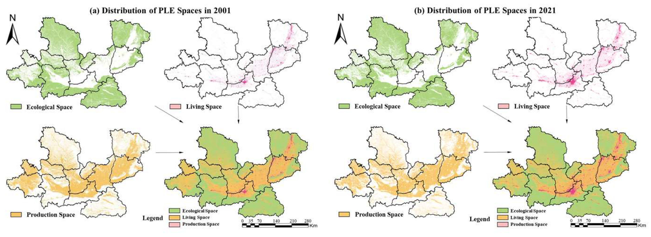 - Li, Y.; Zhao, J.; Zhang, S.; Zhang, G.; Zhou, L. Qualitative-Quantitative Identification and Functional Zoning Analysis of Production-Living-Ecological Space: A Case Study of Urban Agglomeration in Central Yunnan, China. Environ. Monit. Assess. 2023, 195, 1163. [Google Scholar] [CrossRef] [PubMed]