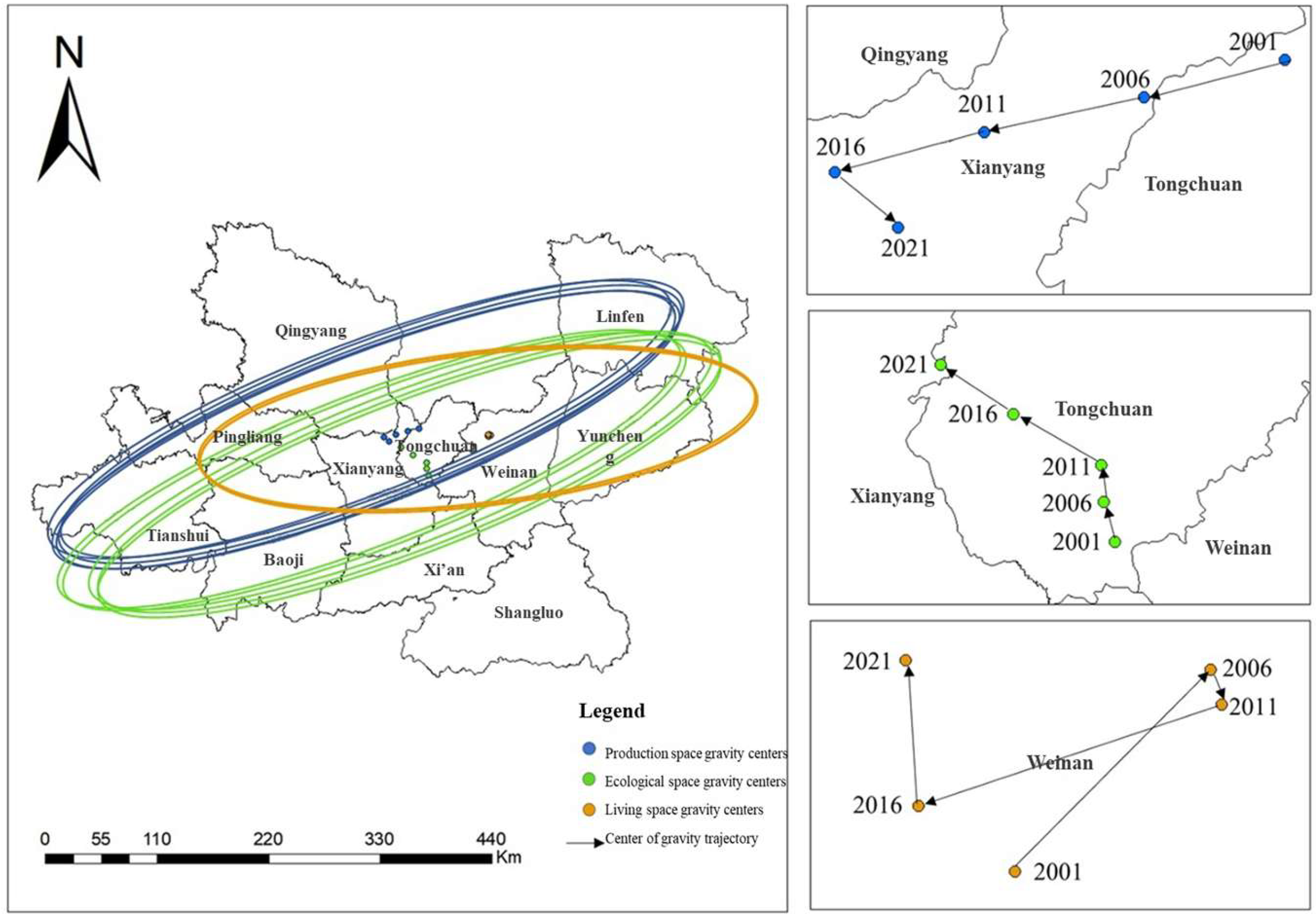 - PLE space evolution in the GPUA exhibits distinct stage characteristics with significant spatial restructuring. Living space expanded by 73.89% while production and ecological spaces contracted by 7.47% and 8.94%, respectively, over the 20-year period. The evolution process displayed four distinct phases—rapid expansion (2001–2006), structural adjustment (2006–2011), quality improvement (2011–2016), and green transformation (2016–2021)—each corresponding to national policy shifts but manifesting with regional time lags. The divergent migration trajectories of PLE space gravity centers (production space shifting 23.4 km southwest, ecological space moving 18.9 km northwest, living space remaining stable) reveal the asymmetric nature of regional development and the persistence of established urban hierarchies despite rapid transformation.