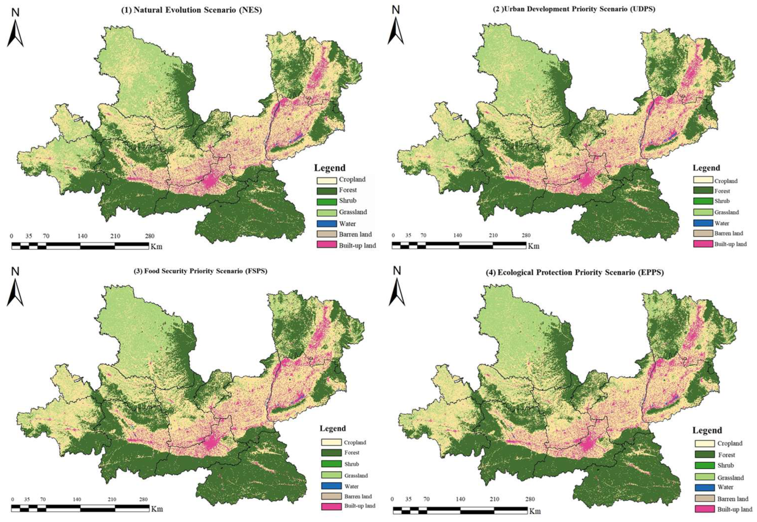 - Urban Development Priority Scenario (UDPS): Emphasizes economic construction and urban expansion. Increases conversion probability from cropland and grassland to built-up land by 30%, reduces built-up land conversion cost by 20%, and sets built-up land neighborhood weight to 1.2.