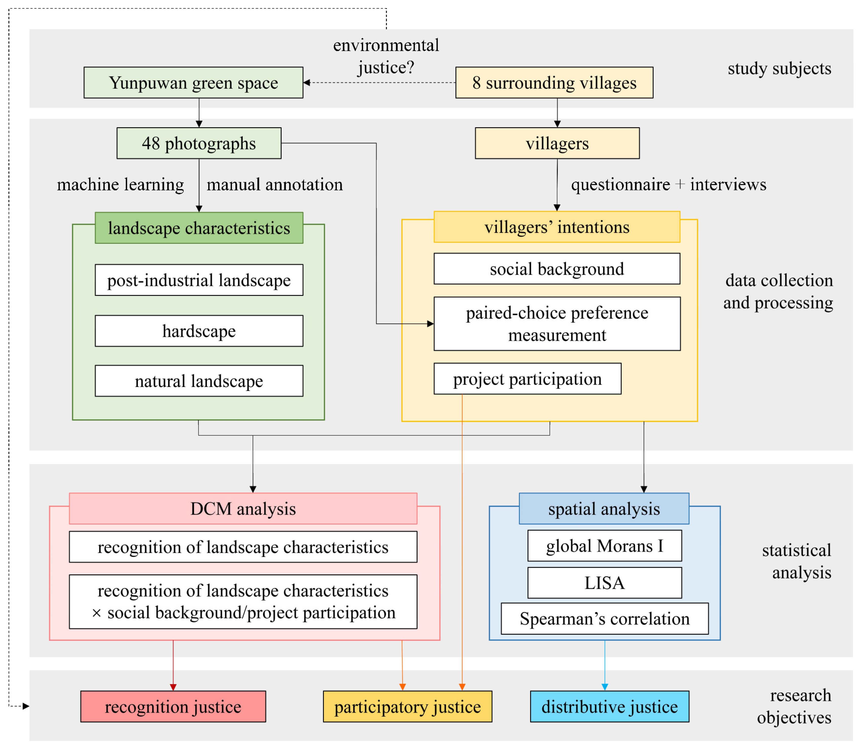 | Recognition Justice | Respect for residents’ identities, cultures, and landscape experiences, including industrial-memory elements | Paired photo preference; landscape characteristics quantification; semi-structured interviews; discrete choice model | [33,34,35,36] |