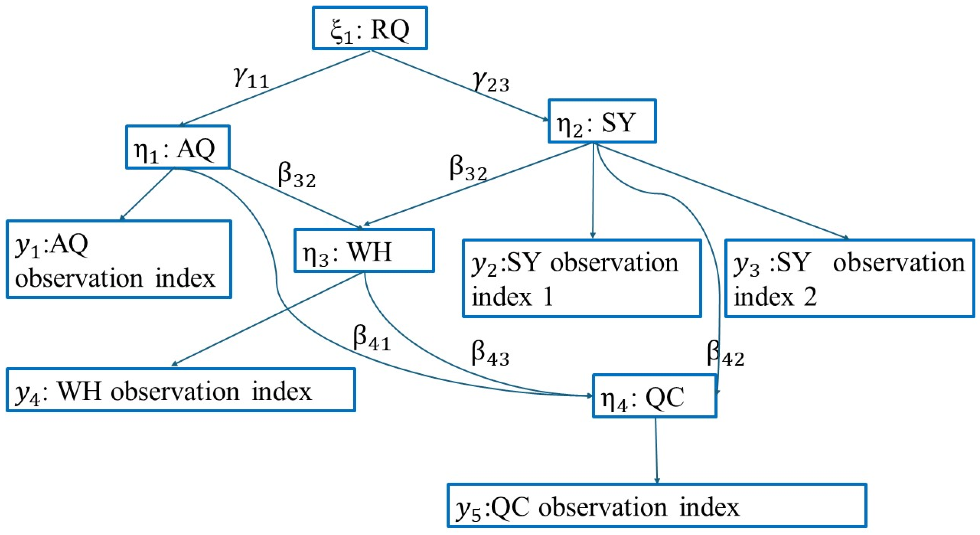 The SEM incorporated six latent variables, each defined by its corresponding observed indicators measured on a Likert 5-level scale (