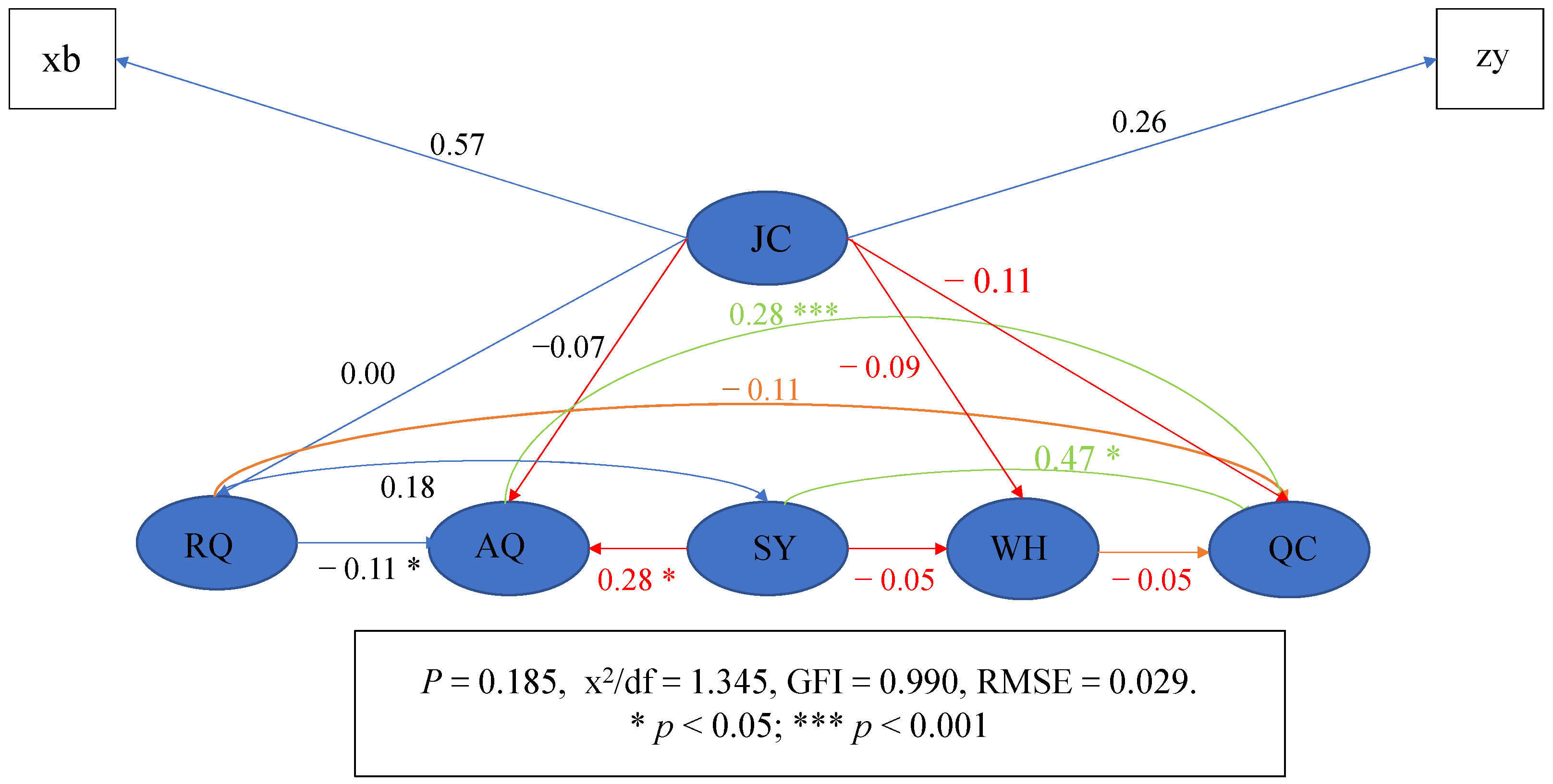 Key hypothesized relationships included: Knowledge of RQ would directly influence AQ. SY would directly influence QC. AQ would directly influence both WH and QC. JC would influence subsequent knowledge, perception, and behavior variables. The key assumption of this model verifies our hypothesis about the “cognitive-use-attitude” chain: the usage status of invasive species (SY) negatively affects the willingness to clear (QC), and safety awareness (AQ) also negatively affects the willingness to clear (QC). At the level of behavioral intention, there are two factors that have a significant direct impact on the intention to clear (QC). Surprisingly, the usage status (SY) showed a significant positive impact on the willingness to clear (QC) (β = 0.47, p < 0.05). AQ has a significant negative impact on the willingness to clear QC (β = 0.28, p < 0.001). At the cognitive formation level, the cognition (RQ) of the invasive attribute of this plant has a marginally significant negative impact on the usage frequency (SY) (β = −0.18, p = 0.08), indicating that residents who understand its invasiveness may reduce its usage. However, the direct path influence of residents’ basic information (JC) and hazard perception (WH) in the model is not significant.