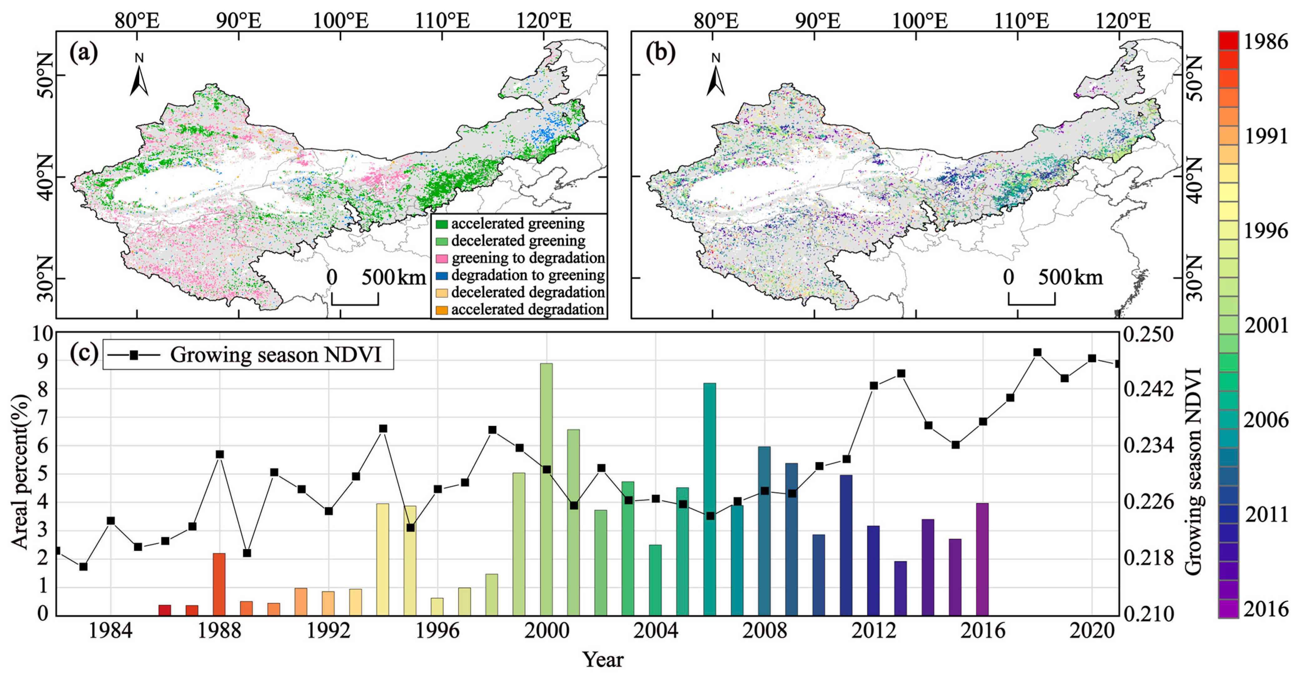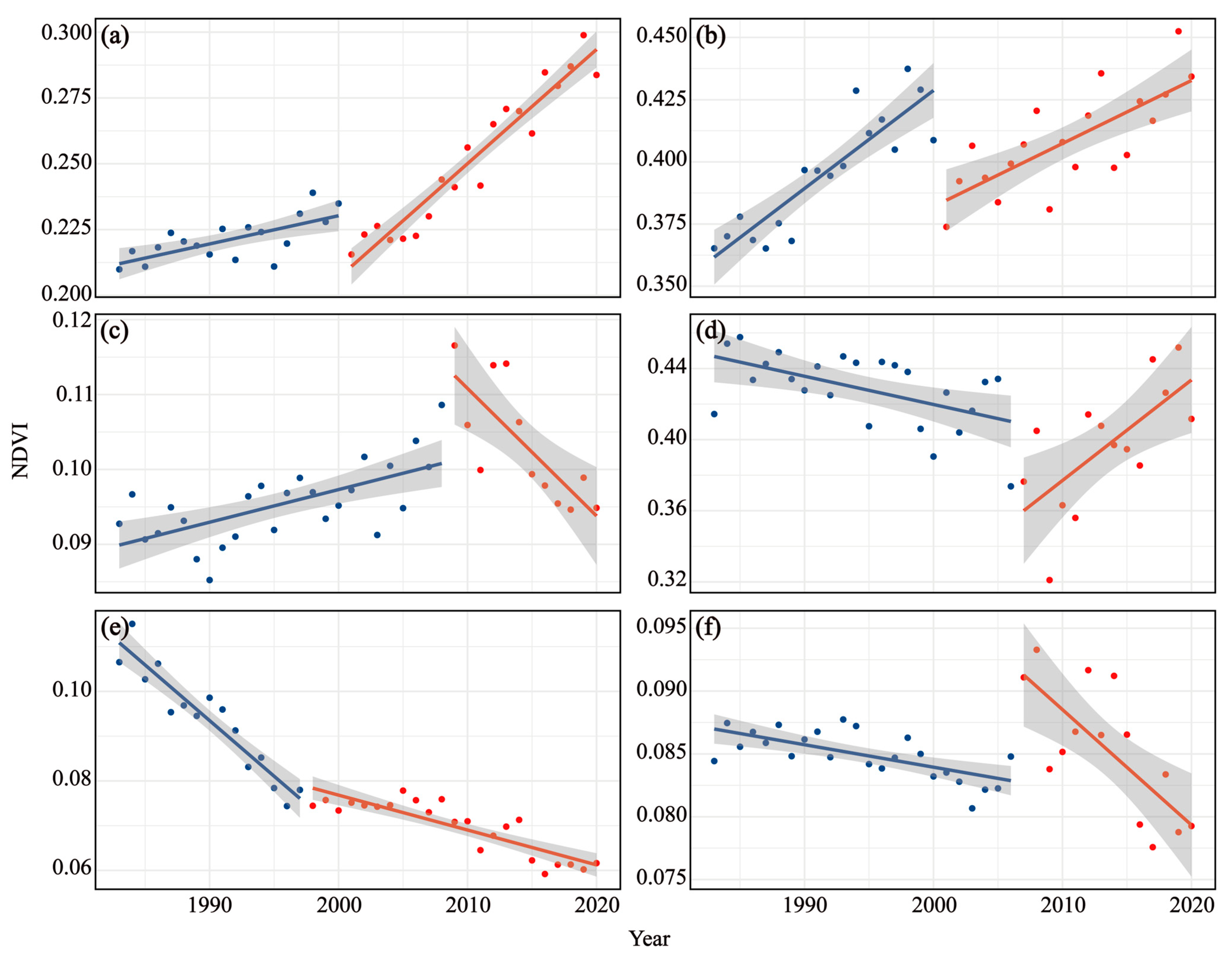 - From 1982 to 2020, vegetation trends in 21.8% of China’s D & DPRs experienced significant shifts, dominated by “accelerated greening”. Among these shifts, 82.4% occurred in or after 1999.