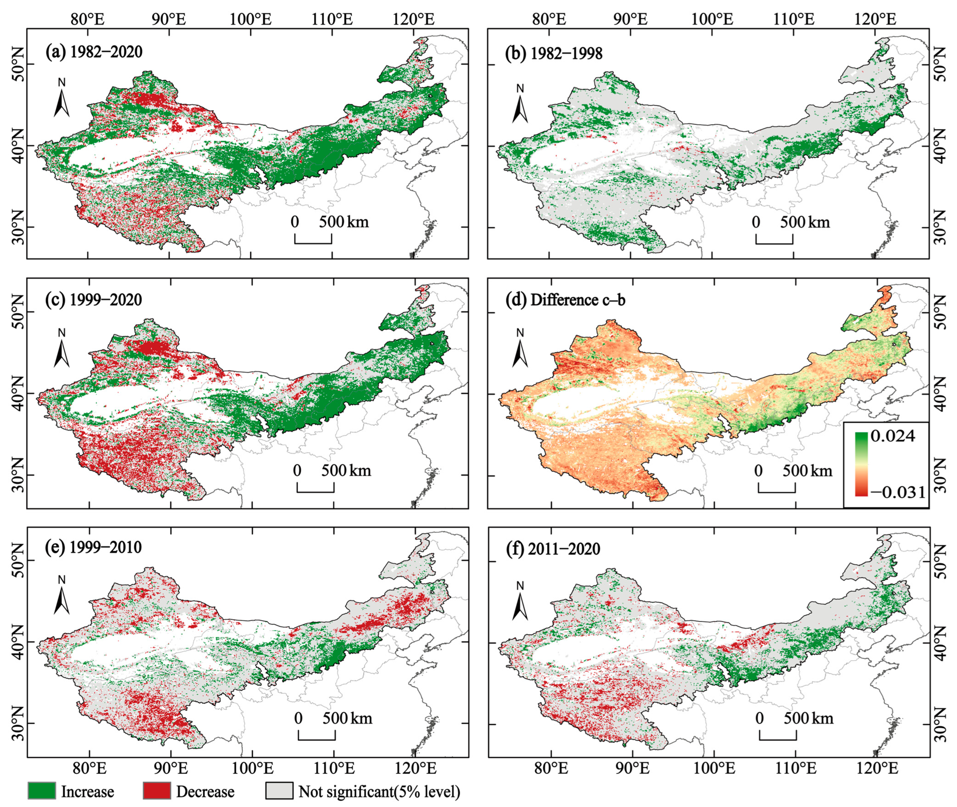 - Compared with the reference period (1982–1998), vegetation restoration and degradation during the restoration period (1999–2020) increased by 15.5% and 21%, respectively, with accelerated greening primarily occurring around the agro-pastoral ecotone.