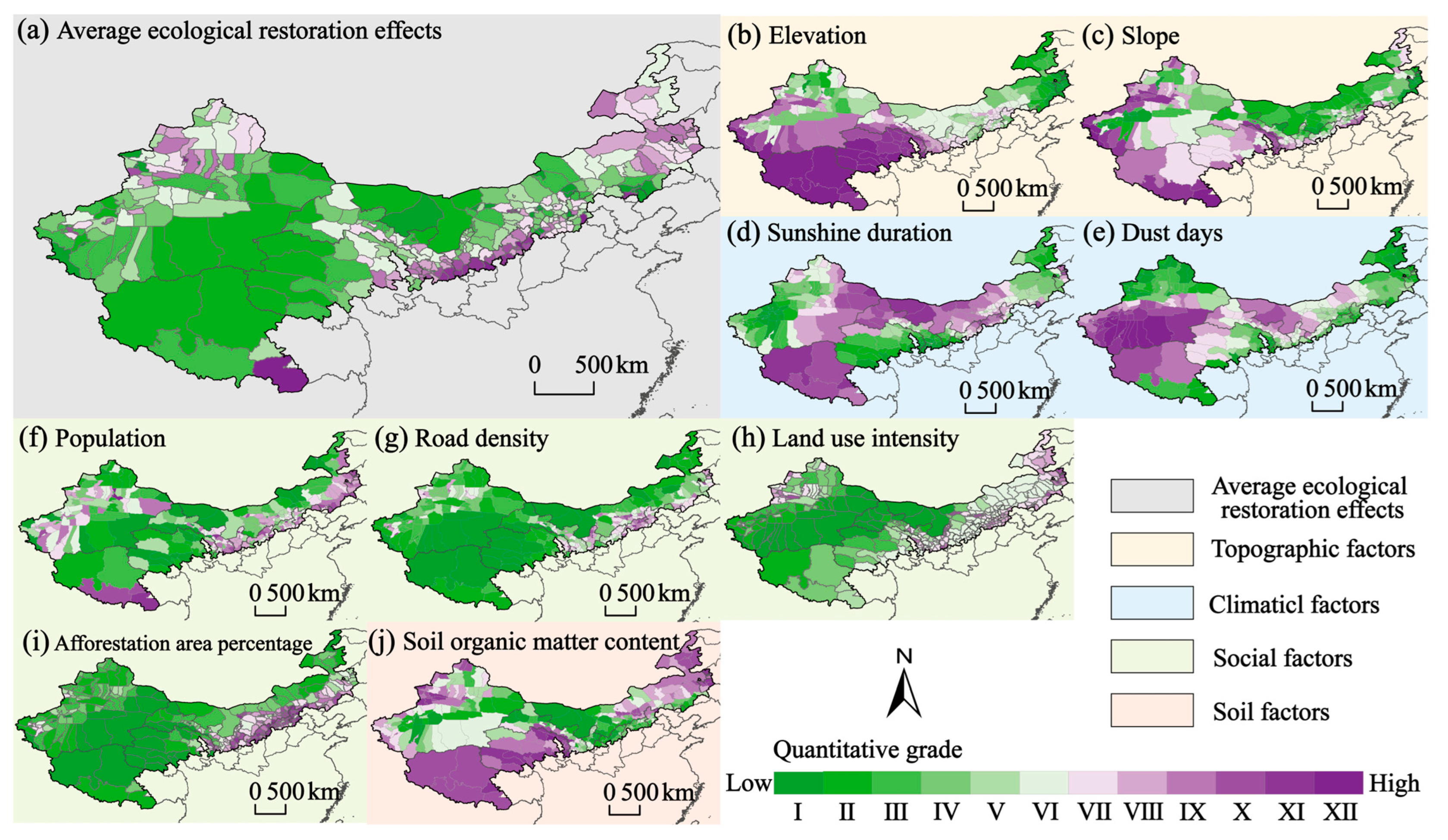 - The ecological restoration effect was influenced by multiple factors, including topographic, climatic, socio-economic, and soil factors, among which population, road density and afforestation area percentage exhibited the strongest explanatory power.