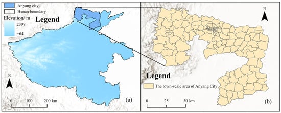 Location of Anyang City and spatial distribution of township–level units. Anyang City covers a total land area of approximately 7413 km2. (a) Location of Anyang City within Henan Province; (b) Administrative districts of townships, three towns and all the streets were excluded from the study area.