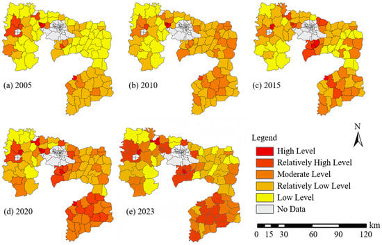 Based on the natural breakpoint classification method, the LED evaluation results at township scale were visualized and categorized into five levels: high, relatively high, medium, relatively low, and low (Figure 2). From the perspective of the overall pattern, high-level areas of LED exhibit two distinct clustering characteristics: a ring-shaped cluster centered on major urban built-up areas, and an industrial cluster concentrated in Huaxian County in the southeast. Medium-level areas are largely distributed around the high-level areas, demonstrating a clear spatial spillover effect. In contrast, low-level areas are mainly concentrated in the Taihang Mountains in the northwest and along the provincial border in the northeast, forming a continuous low-value belt.