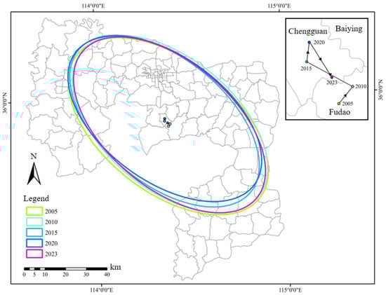From the perspective of the overall ellipse pattern, the major axis of the standard deviational ellipse follows a northwest–southeast orientation, with the rotation angle θ increasing from 128.238° in 2005 to 130.349° in 2023. This indicates that between 2005 and 2023, township-level LED in Anyang consistently exhibited a northwest–southeast spatial configuration, which is consistent with the overall distribution of high-value areas described above. The flatness ratio increased from 0.432 to 0.445, suggesting an intensified polarization in spatial distribution, driven by the rapid rise in LED in the townships of Linzhou and Huaxian counties.