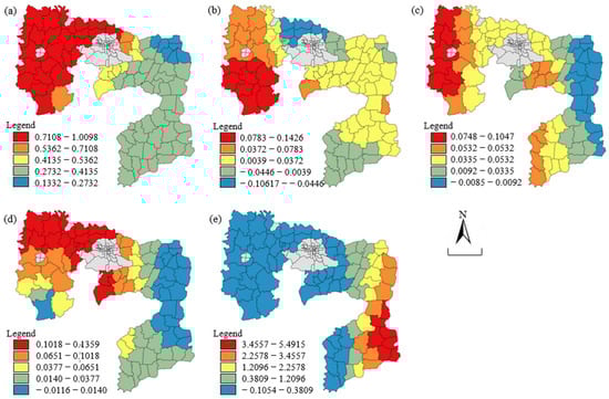 Spatial distribution of regression coefficients for influencing factors of township-level LED in Anyang: (a) economic development status; (b) industrial structure optimization; (c) locational advantage; (d) government support intensity; (e) natural conditions.